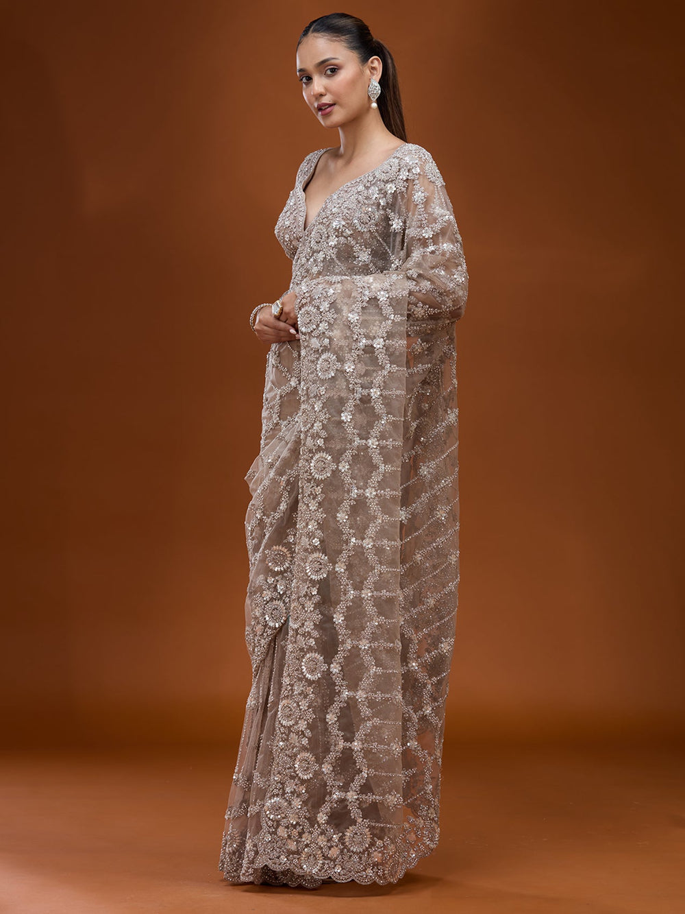 | Beige Stonework Tissue Saree | $159.00 USD | |