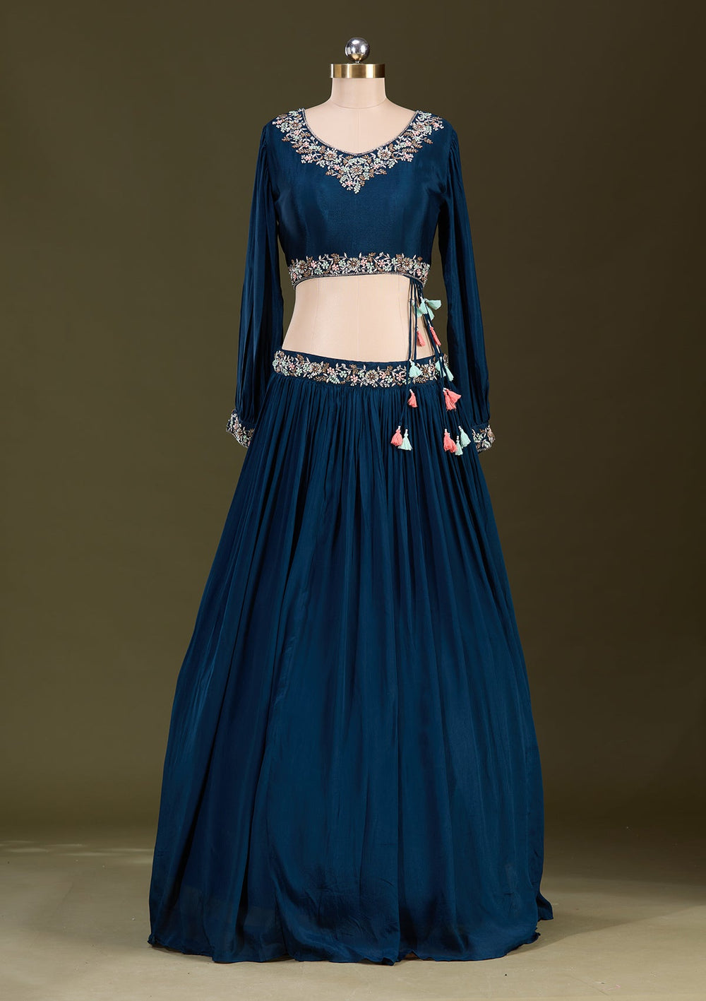 | Navy Blue Stonework Tissue Readymade Lehenga | $209.00 USD | |