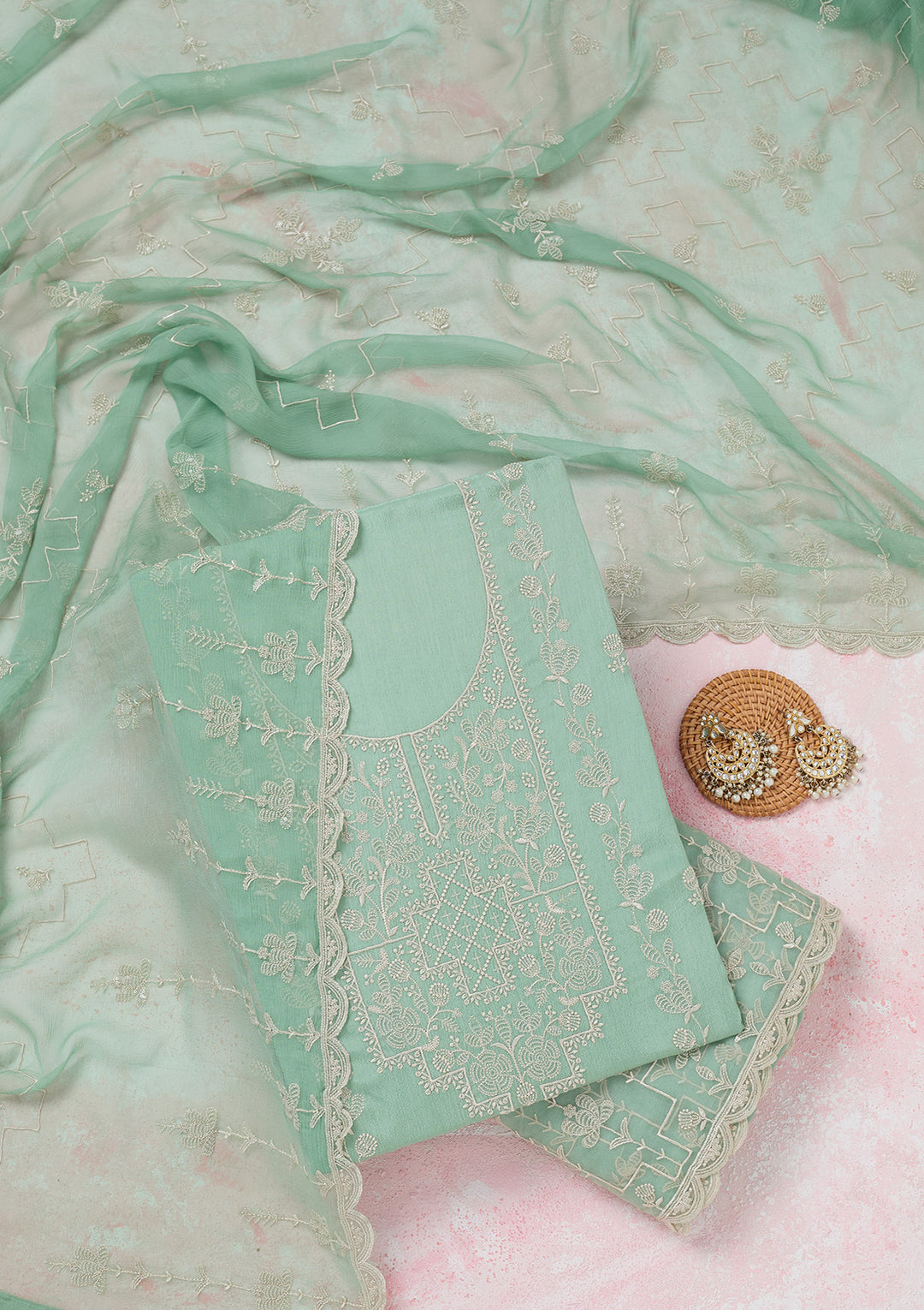 | Sea Green Threadwork Chinon Unstitched Salwar Suit | $79.00 USD | |