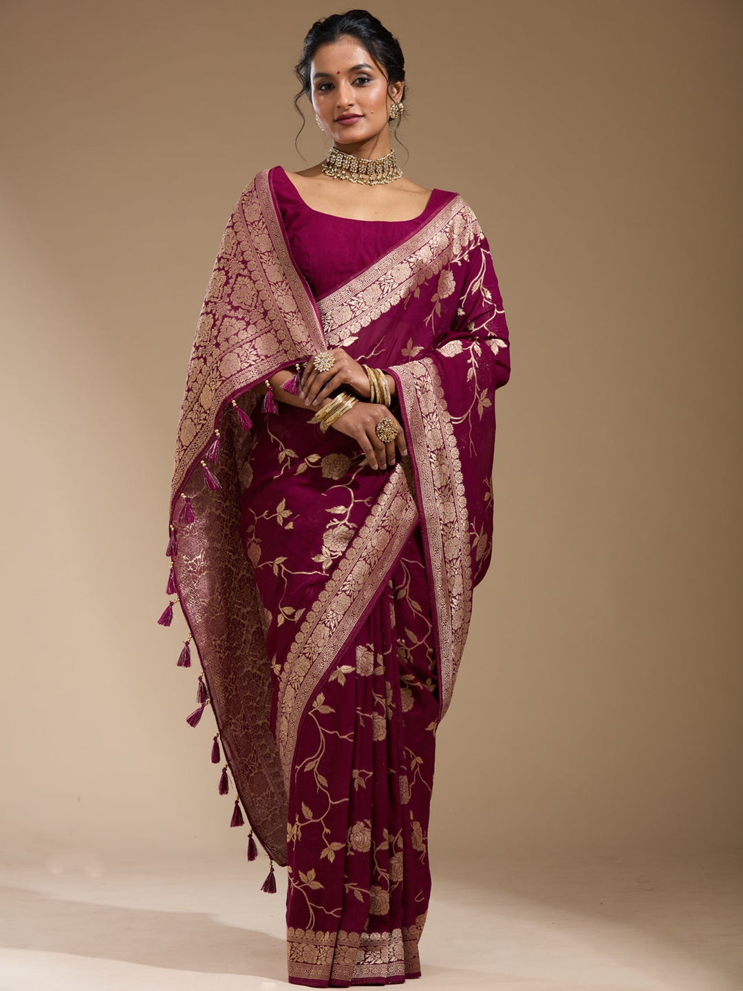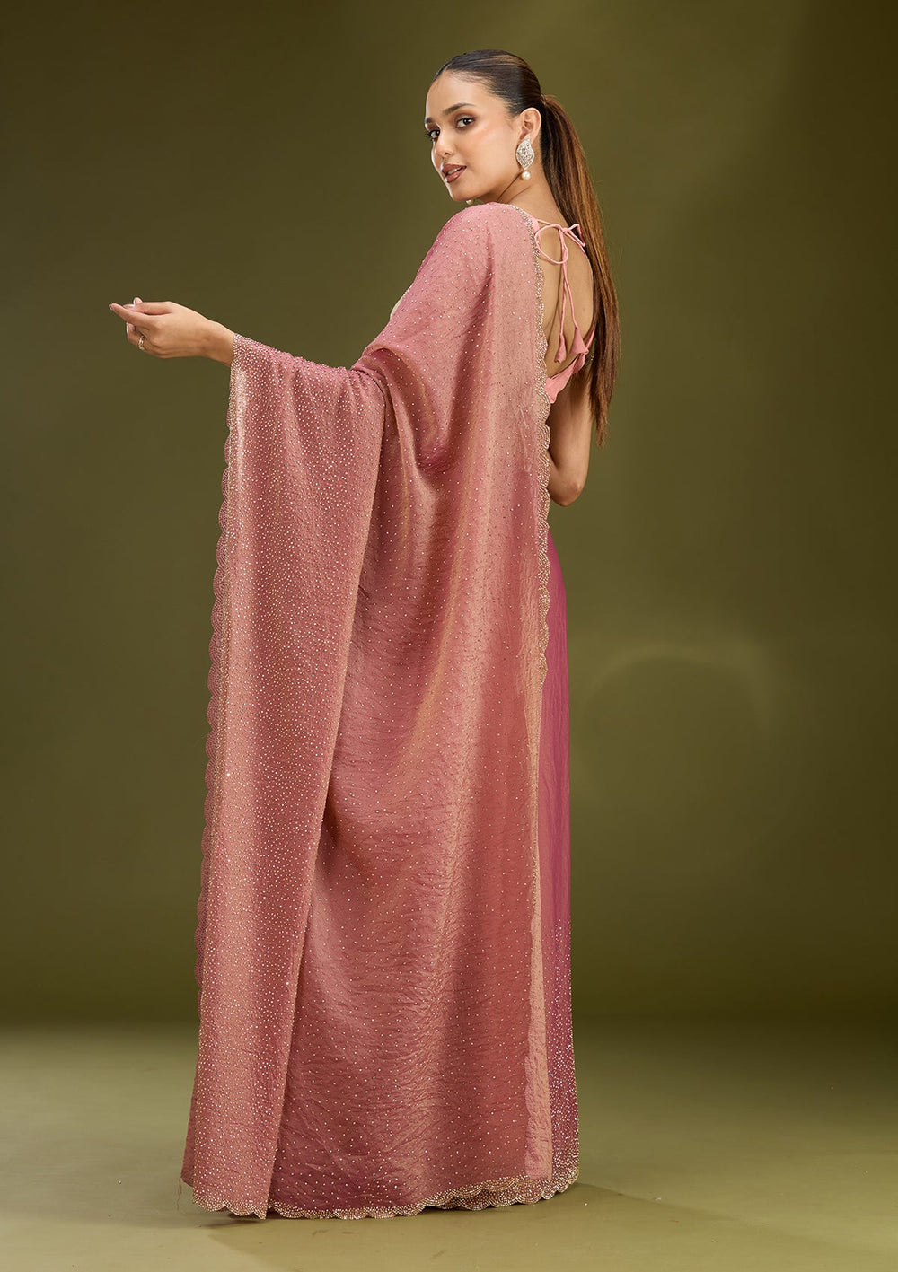 | Onion Pink Stonework (Gold) Tissue Saree | $129.00 USD | |