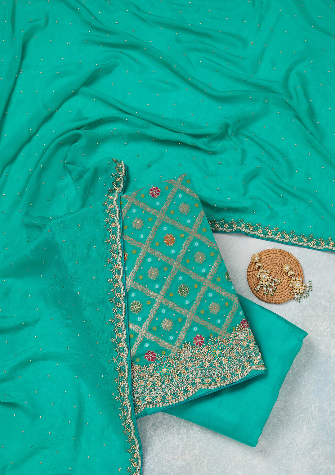 | Leaf Green Zariwork (Gold) Organza Unstitched Salwar Suit | $47.00 USD | |