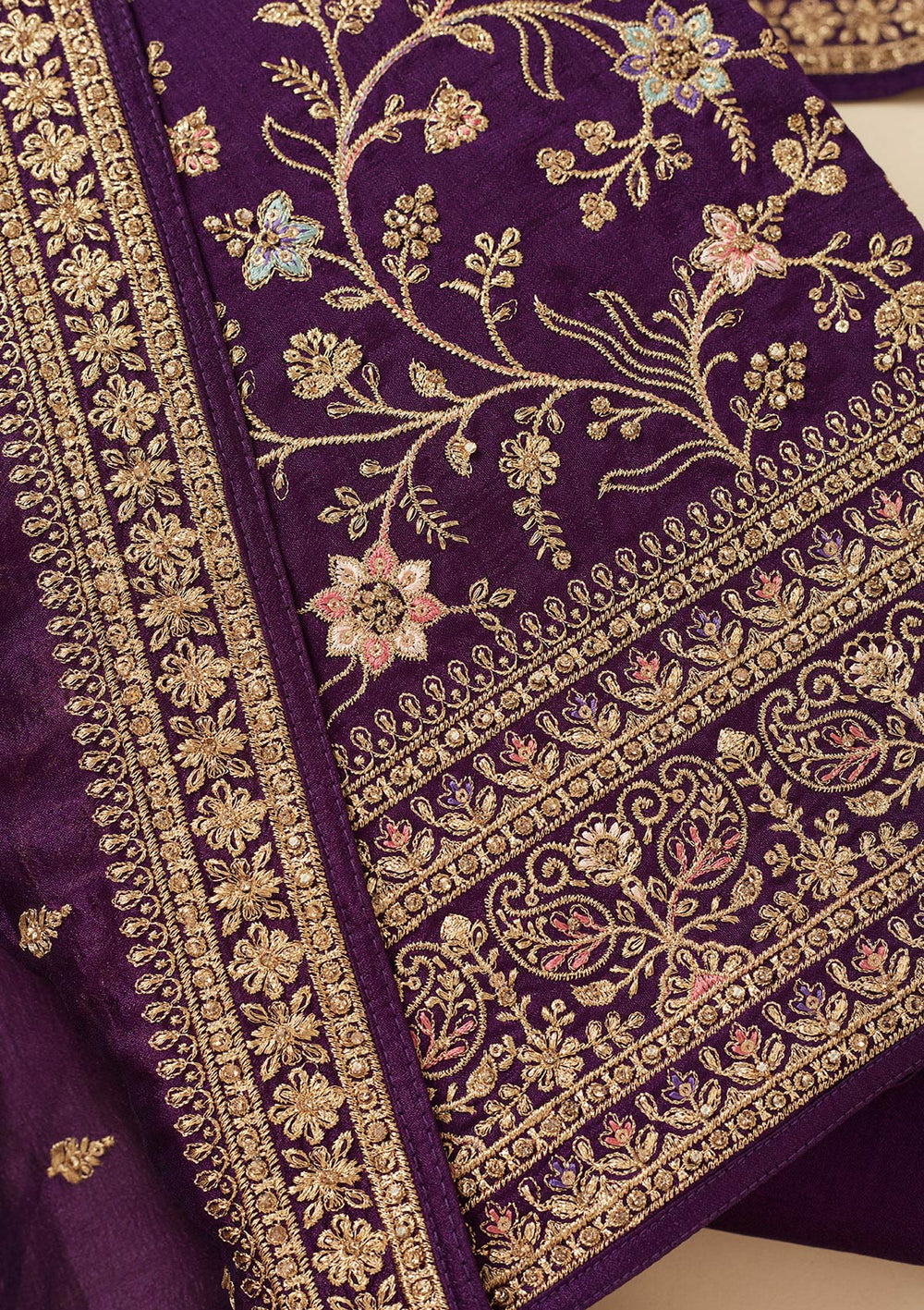 | Purple Zariwork (Gold) Chinon Unstitched Salwar Suit | $129.00 USD | |