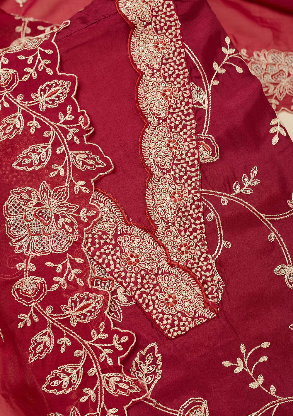 | Wine Zariwork (Gold) Chinon Unstitched Salwar Suit | $129.00 USD | |