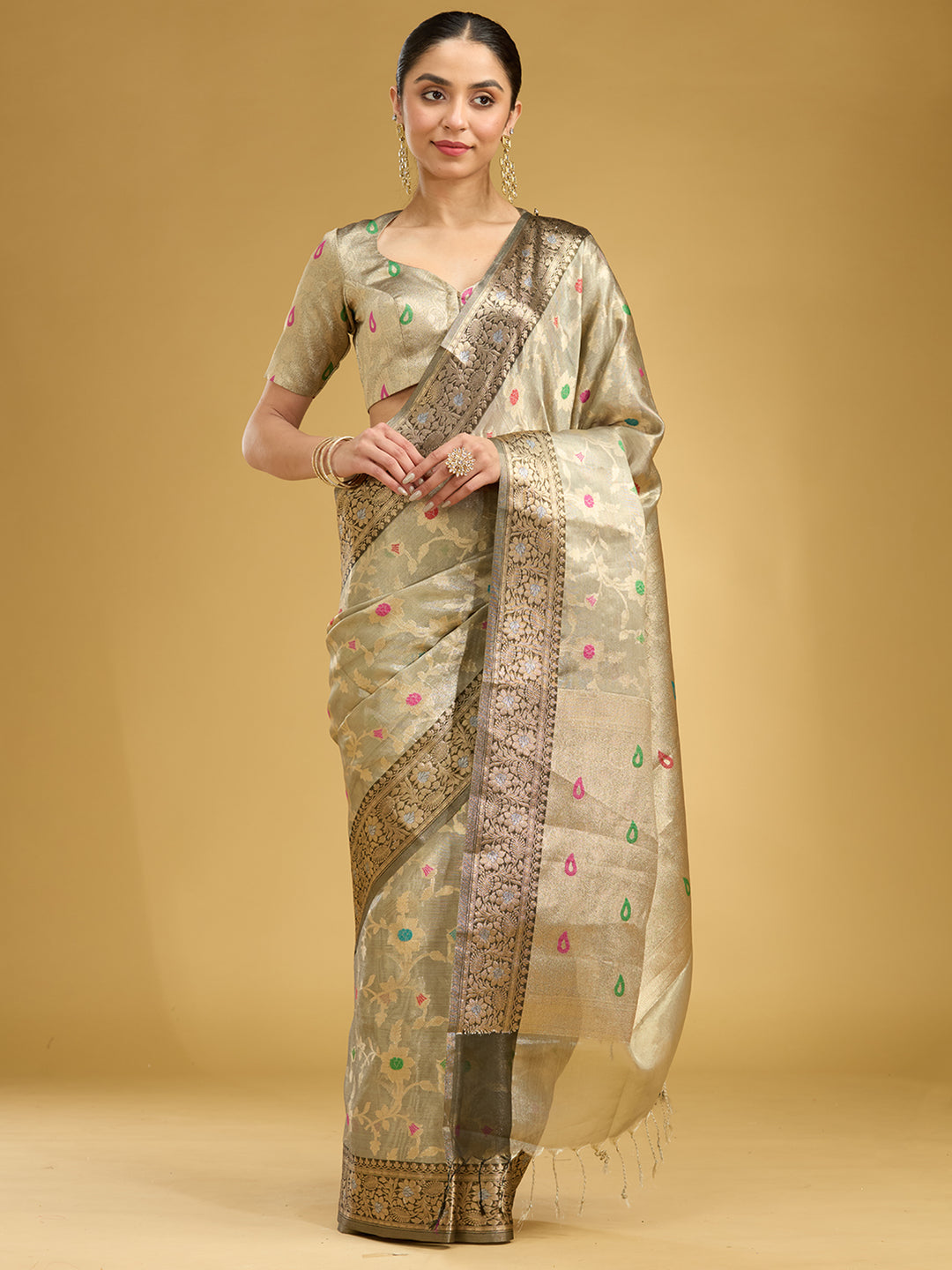 | Light Grey Zariwork Tissue Silk Saree | $89.00 USD | |