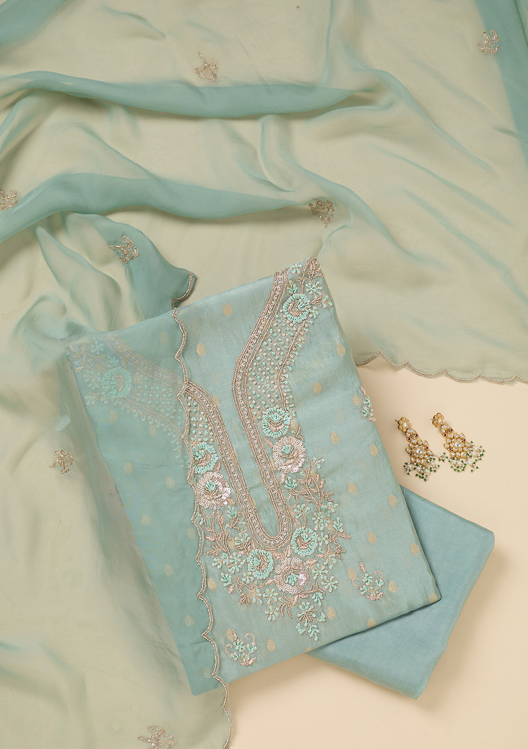 | Sea Green Pearlwork Soft Raw Silk Unstitched Salwar Suit | $87.00 USD | |