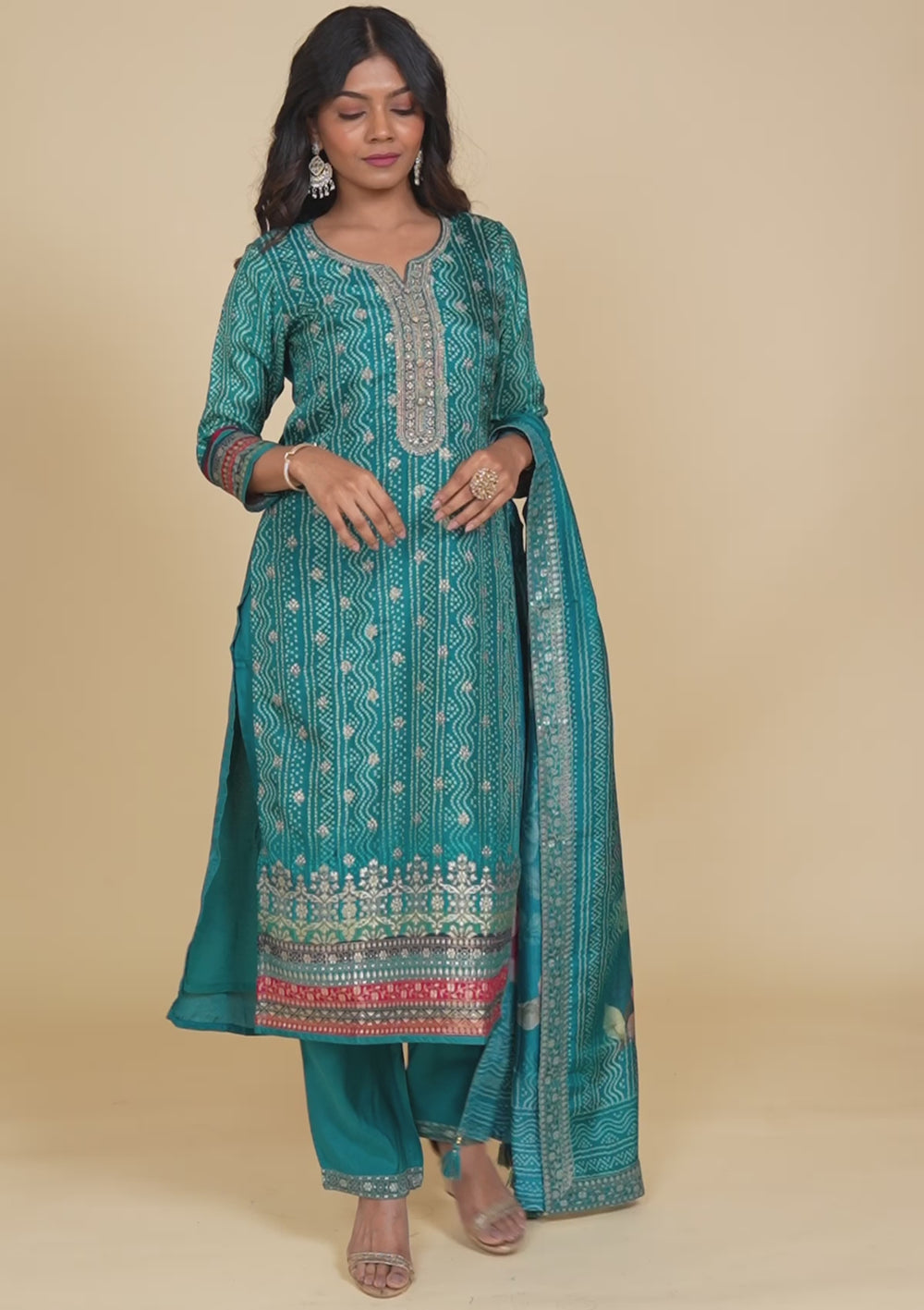 Bottle Green Threadwork Poly Chanderi Unstitched Salwar Suit | $55.00 USD | |