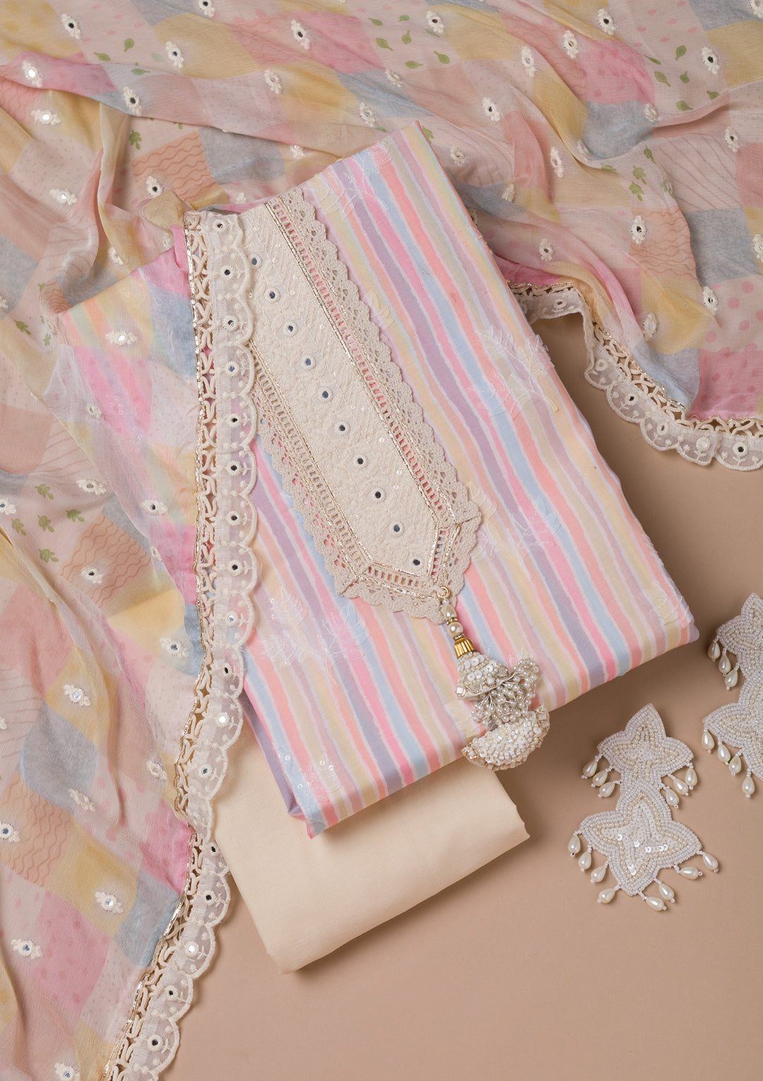 Beige Threadwork Organza Unstitched Salwar Suit-Koskii