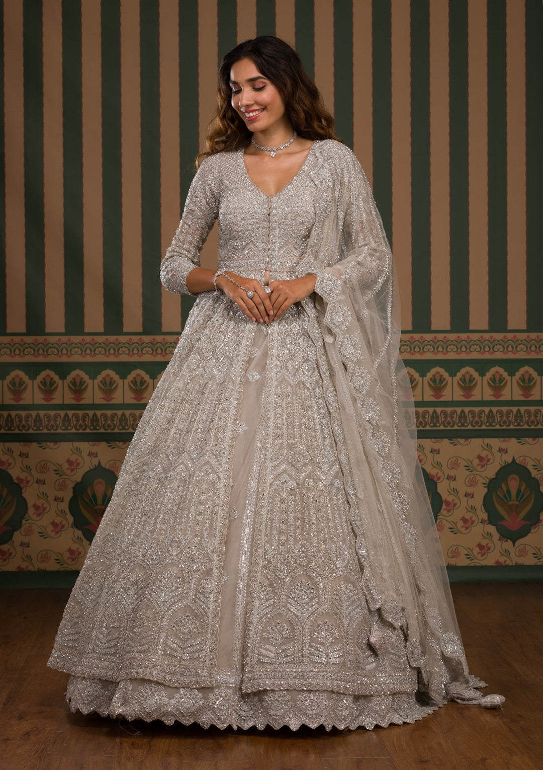 Light Grey Threadwork Georgette Unstitched Salwar Kameez-Koskii