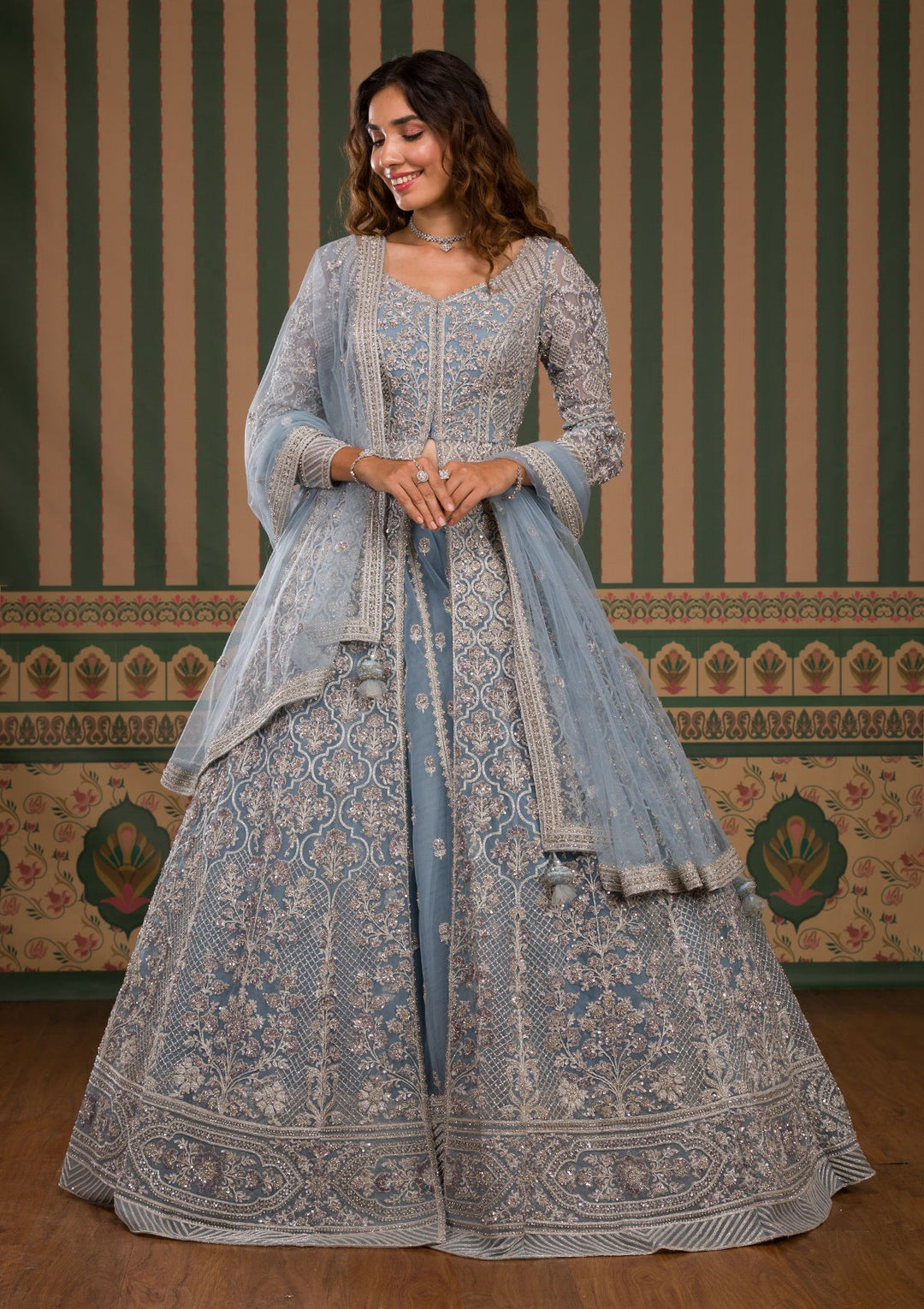 Sky Blue Zariwork Semi Crepe Unstitched Salwar Kameez-Koskii