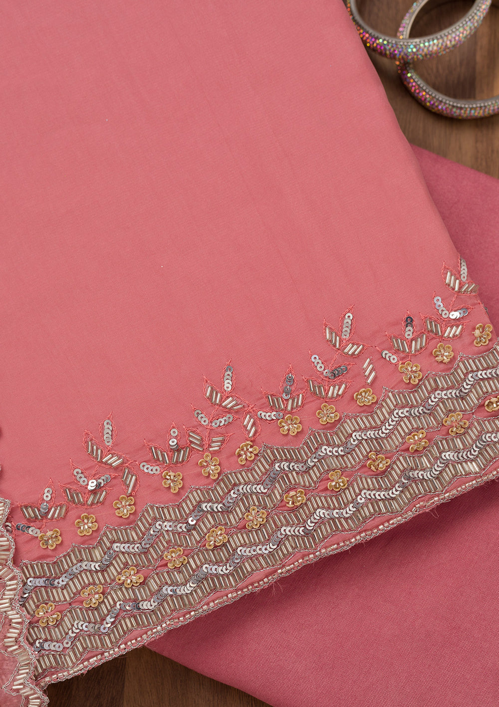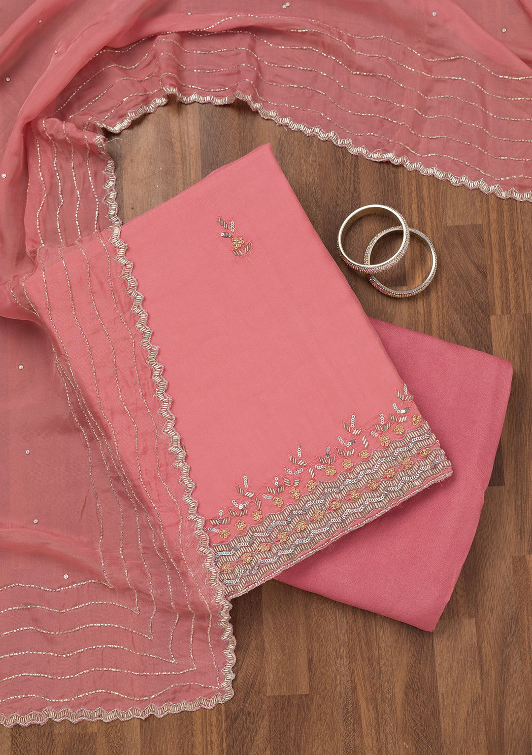 | Pink Cording Chinon Unstitched Salwar Suit | $103.00 USD | |