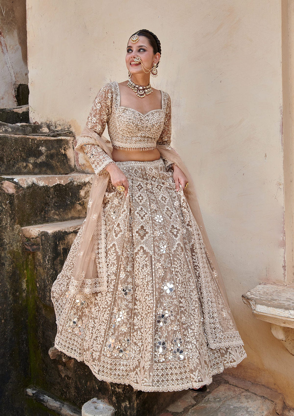 | Beige Mirrorwork Net Readymade Lehenga | $599.00 USD | |