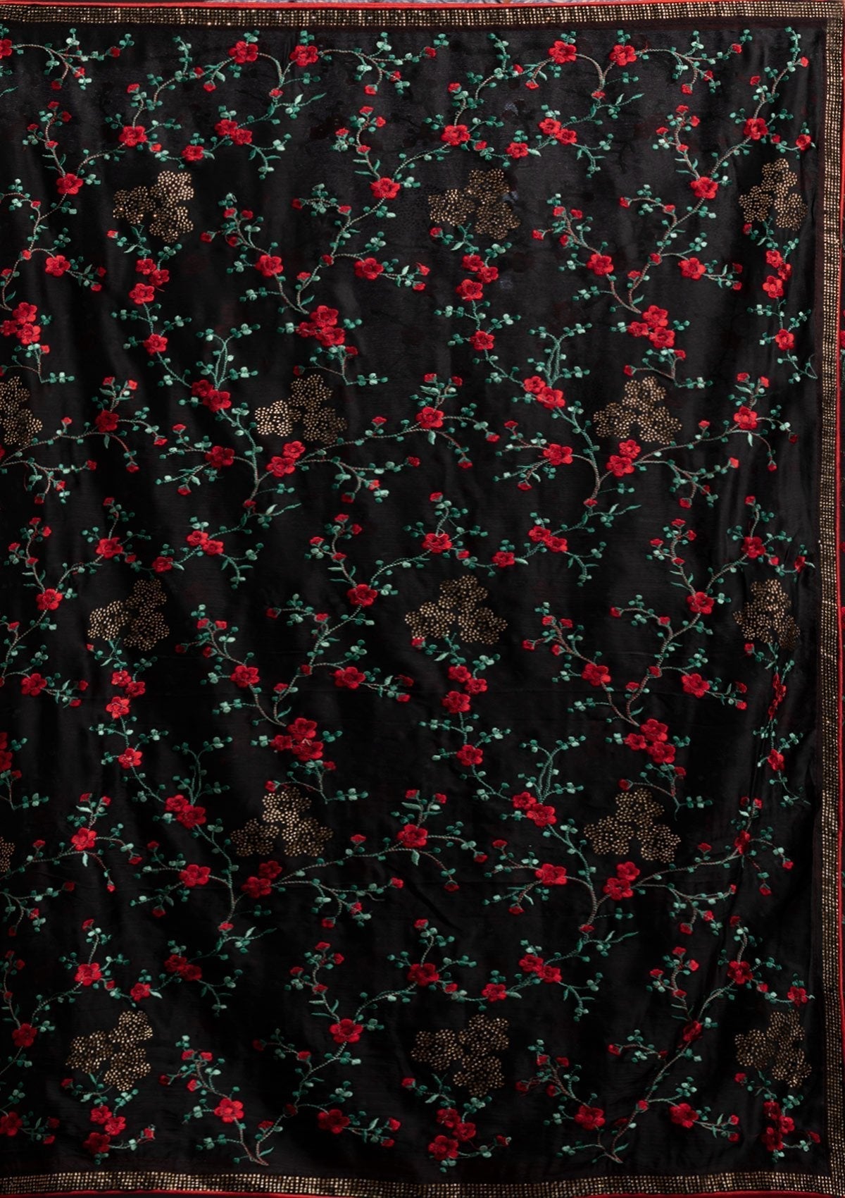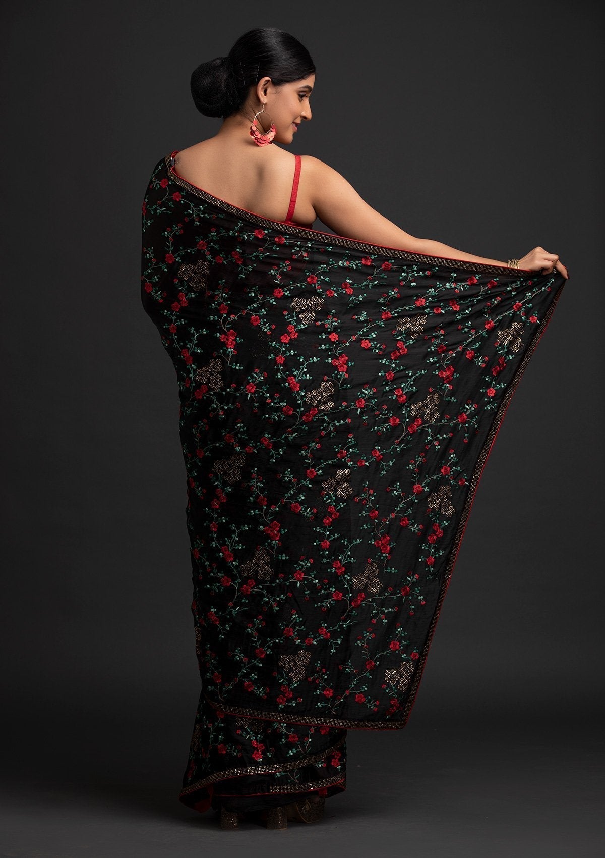 Black Saree In Art Silk. The Saree Is Embellished With Swarovski Embroidery. Paired With A Matching Unstitched Blouse. Comes With The Koskii Promise Of Superior Quality.
