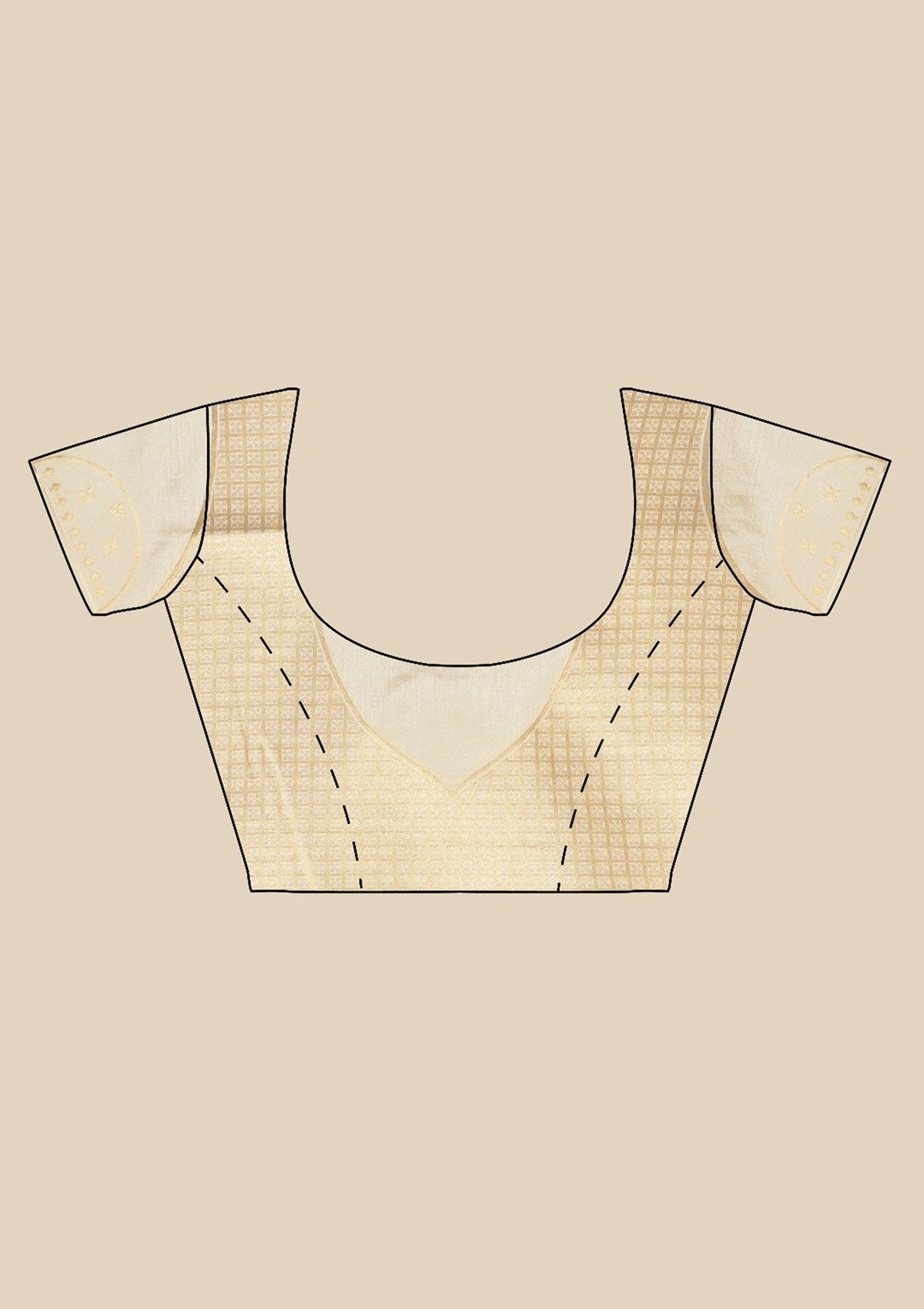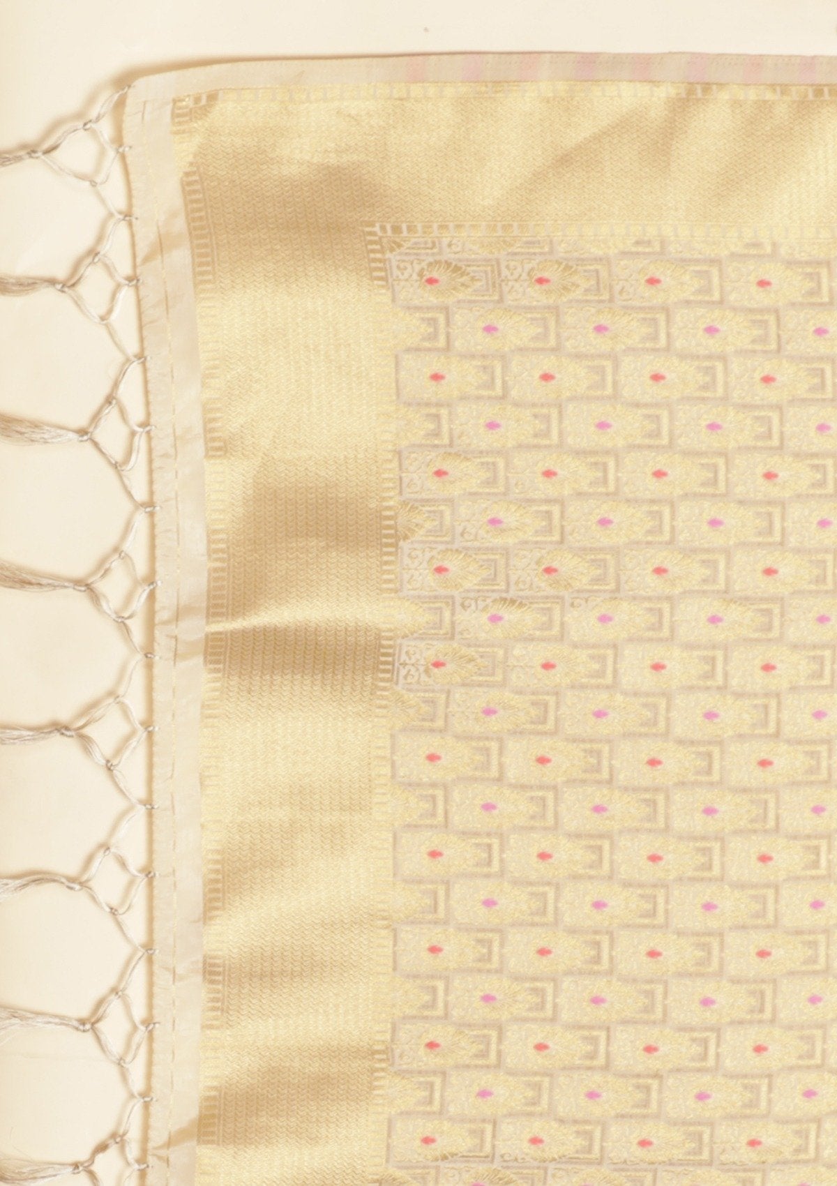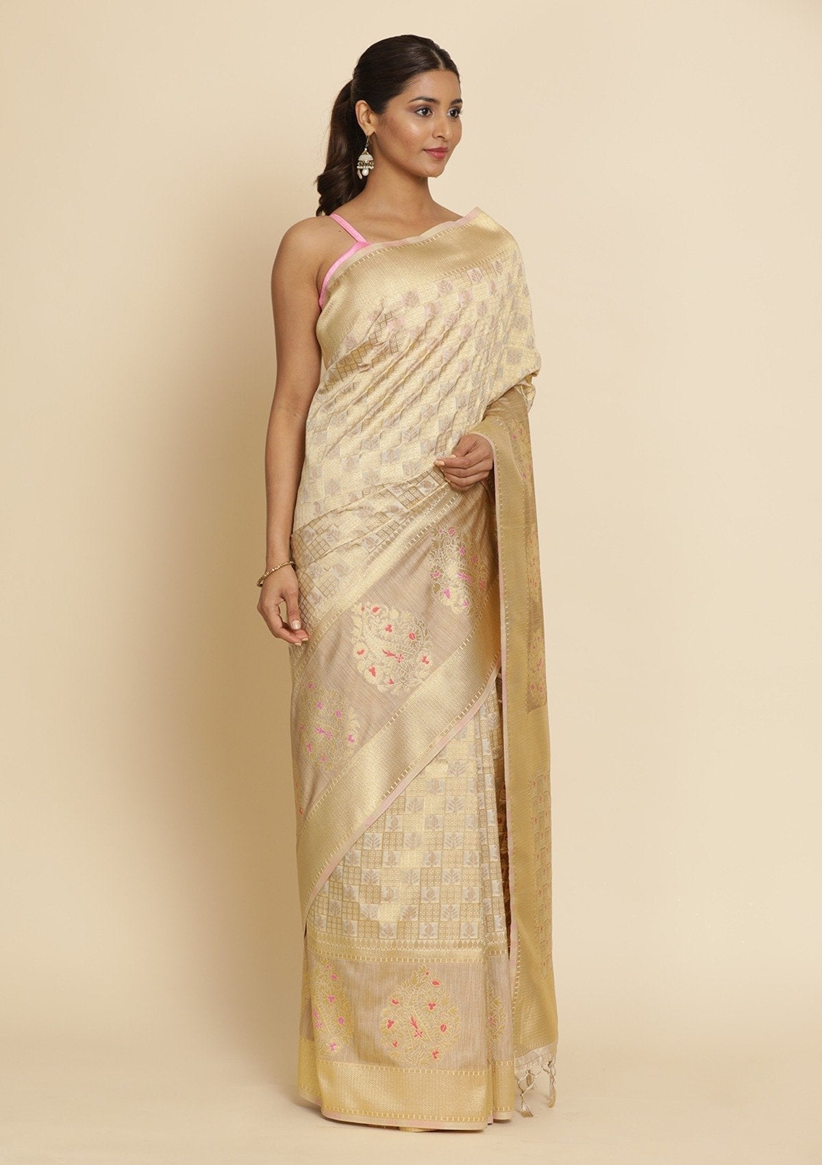Cream Saree In Raw Silk. The Saree Is Embellished With Subtle Embroidery. Paired With A Matching Unstitched Blouse. Comes With The Koskii Promise Of Superior Quality.