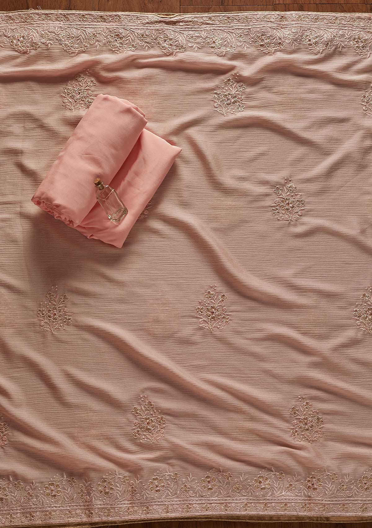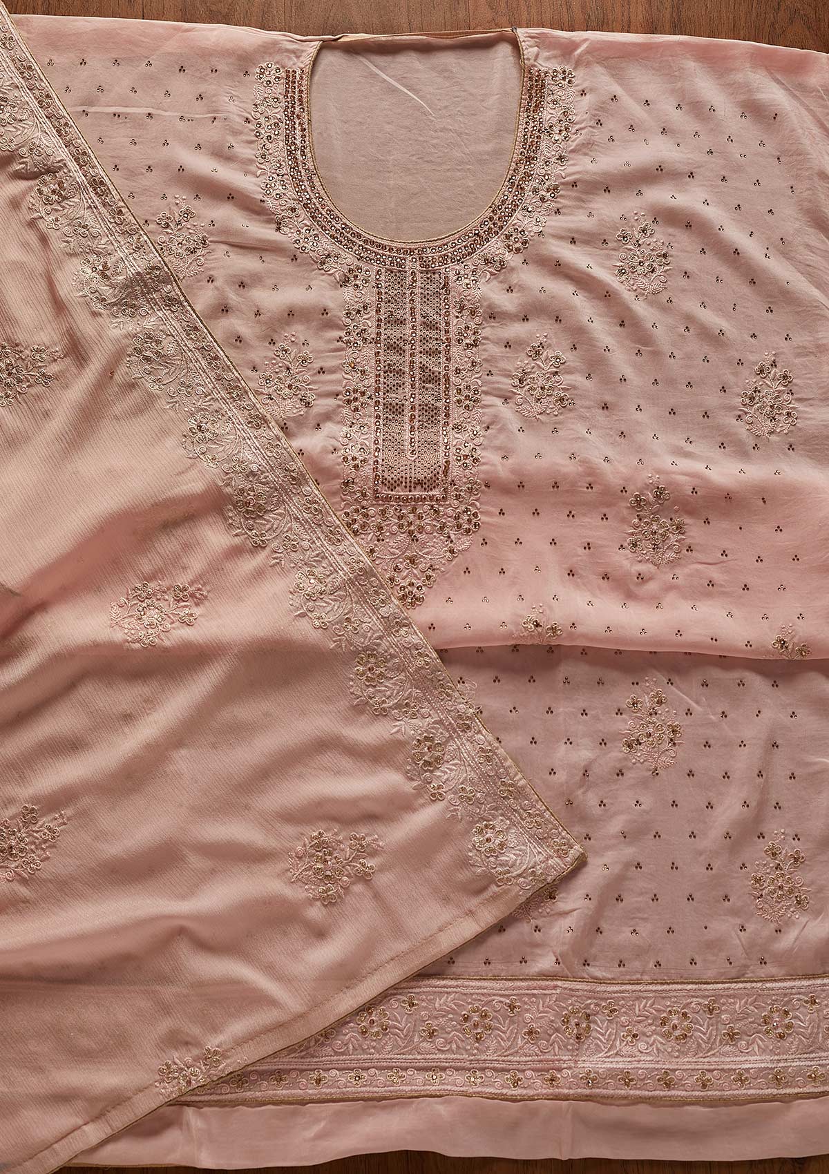 Baby Pink Salwar Suit In Semi Crepe Fabric. The Salwar Suit Is Embellished With Swarovski stone work. Accompanied with an unstitched bottom and dupatta. Comes With The Koskii Promise Of Premium Quality.