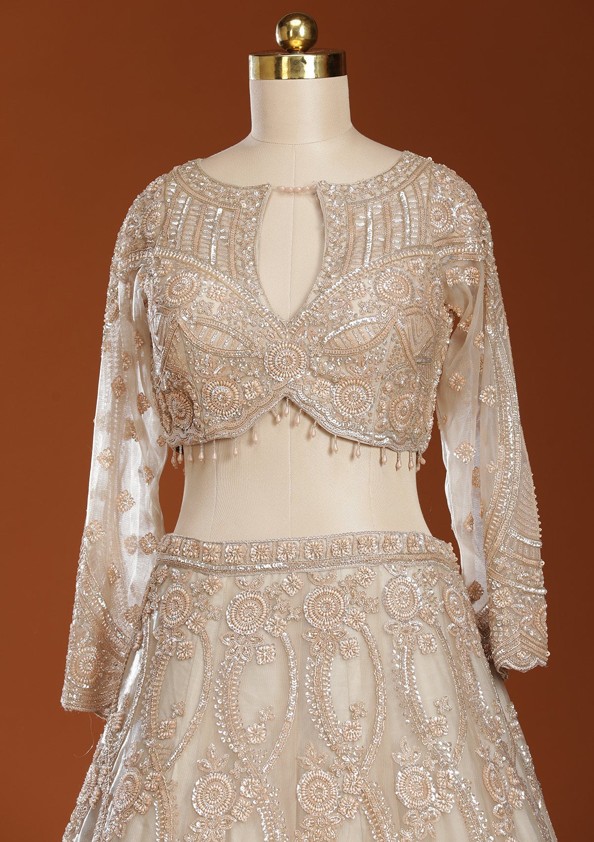 Beige Readymade Lehenga in Net fabric. The Lehenga is embellished with Cutdana embroidery. Accompanied with an Readymade blouse and dupatta. Comes with the Koskii promise of premium quality.