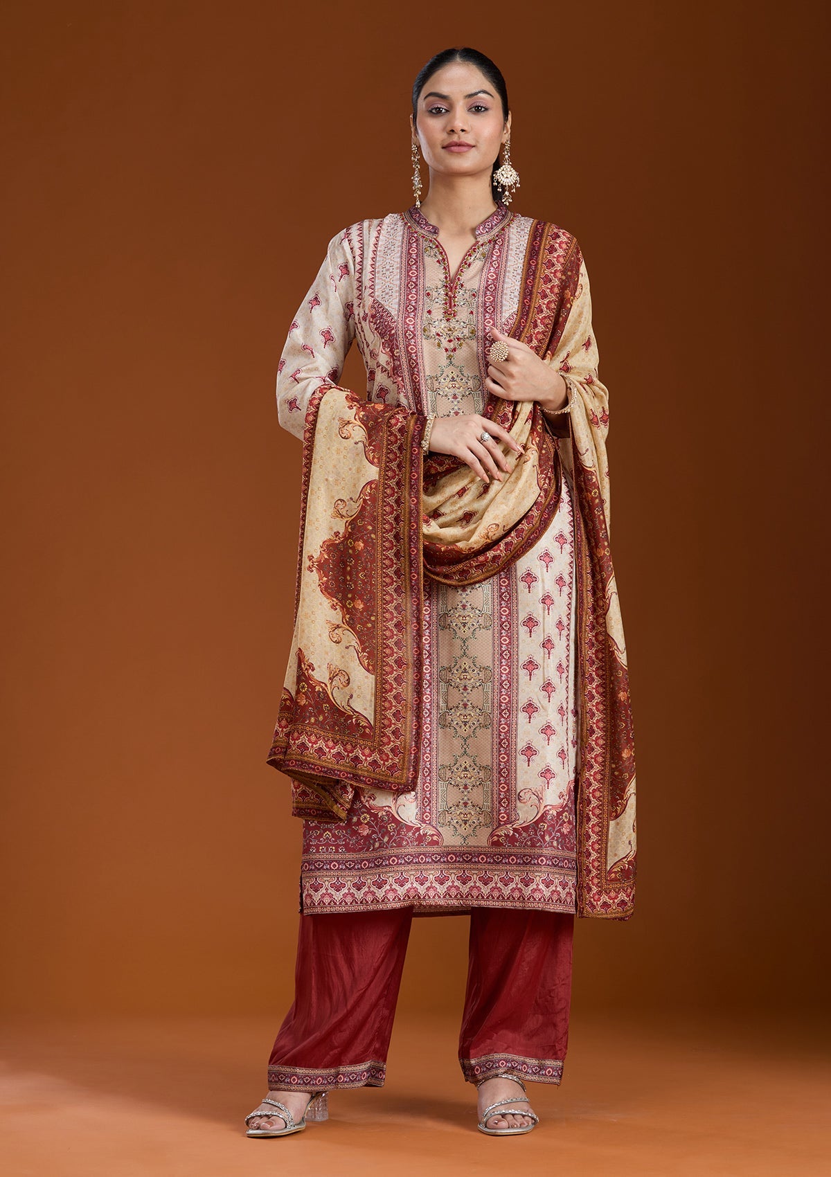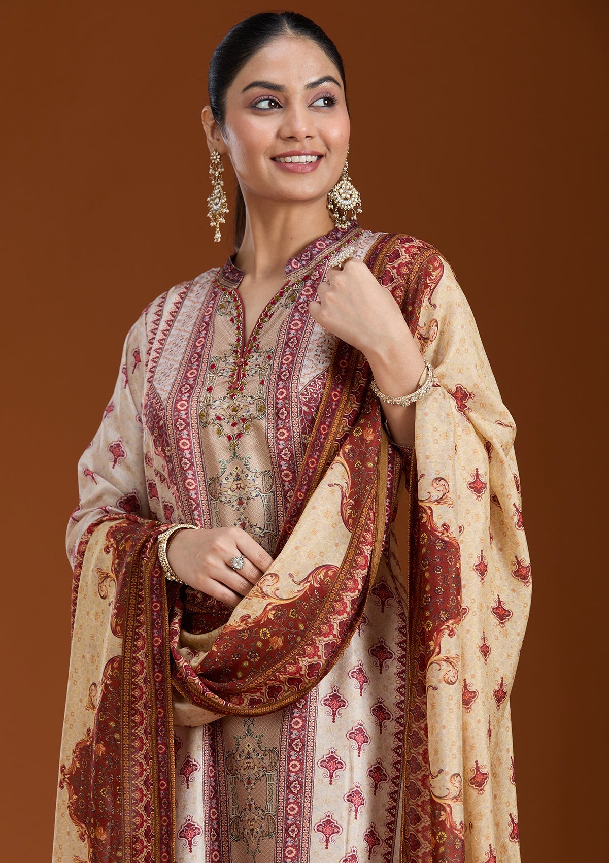 Beige Salwar Suit in Crepe fabric. The Salwar Suit is embellished with Printed embroidery. Accompanied with a bottom and dupatta. Comes with the Koskii promise of premium quality.