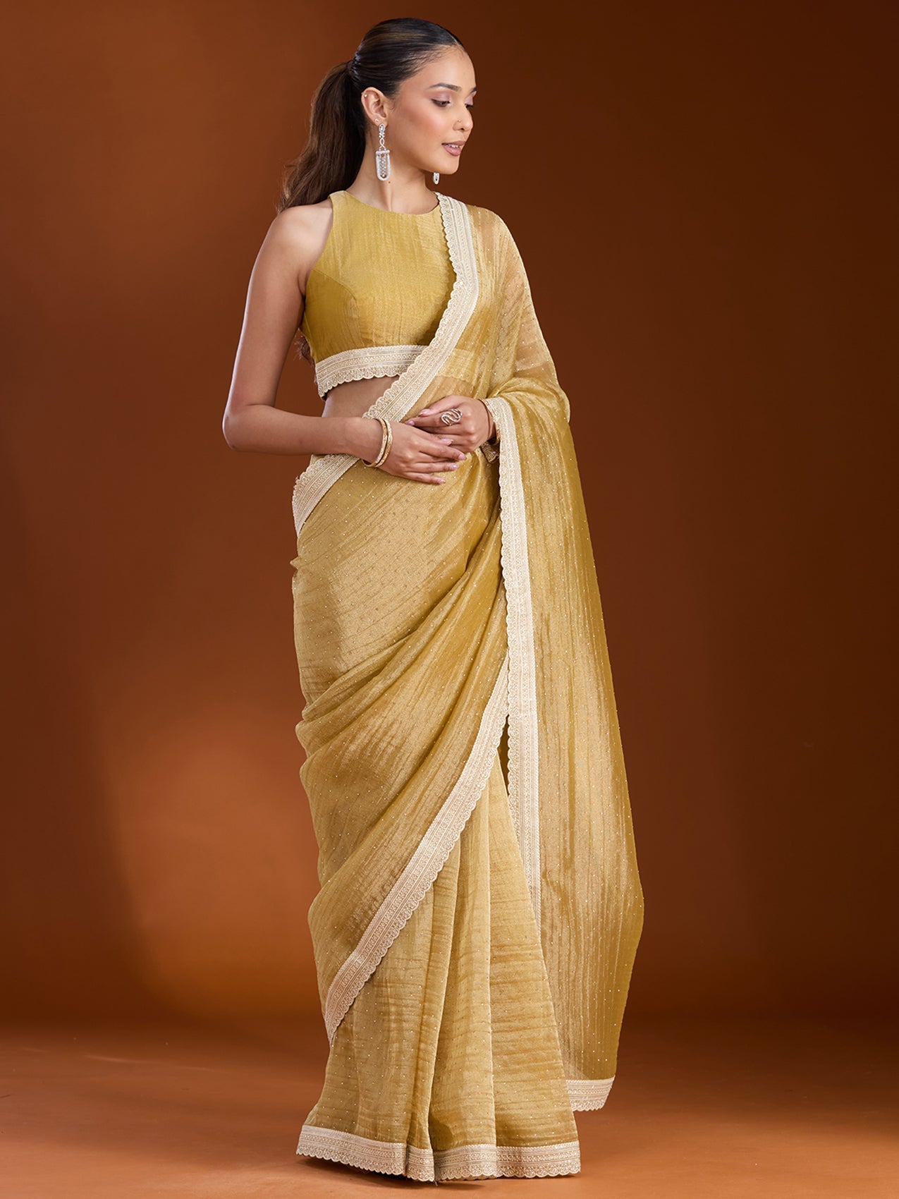 Mustard Saree in Tissue fabric. The Saree is elevated with Zariwork (Gold) embroidery. It comes with an Unstitched blouse. Comes with the Koskii promise of premium quality.