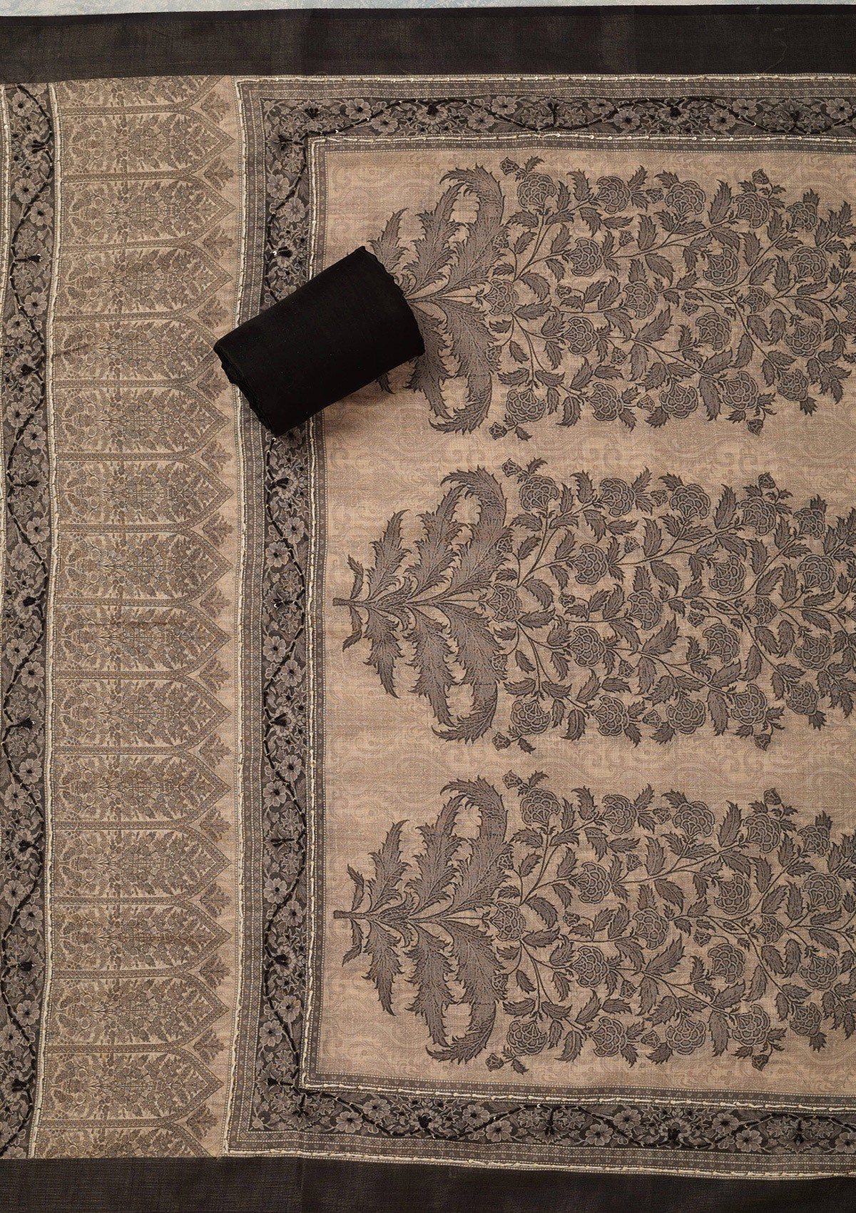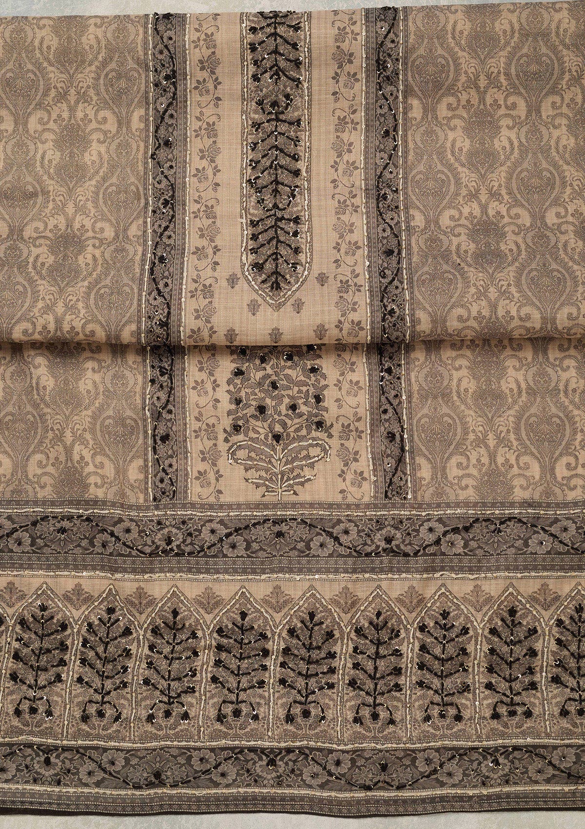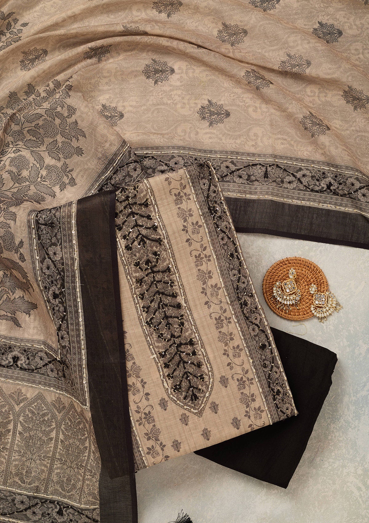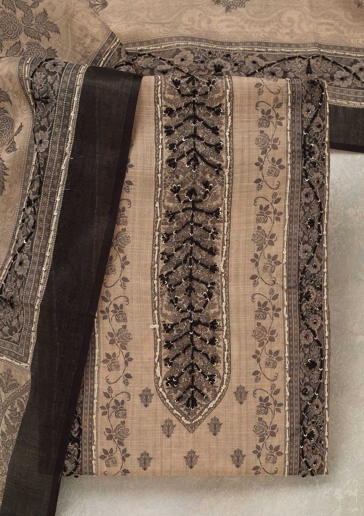 Beige Threadwork Chanderi Unstitched Salwar Suit