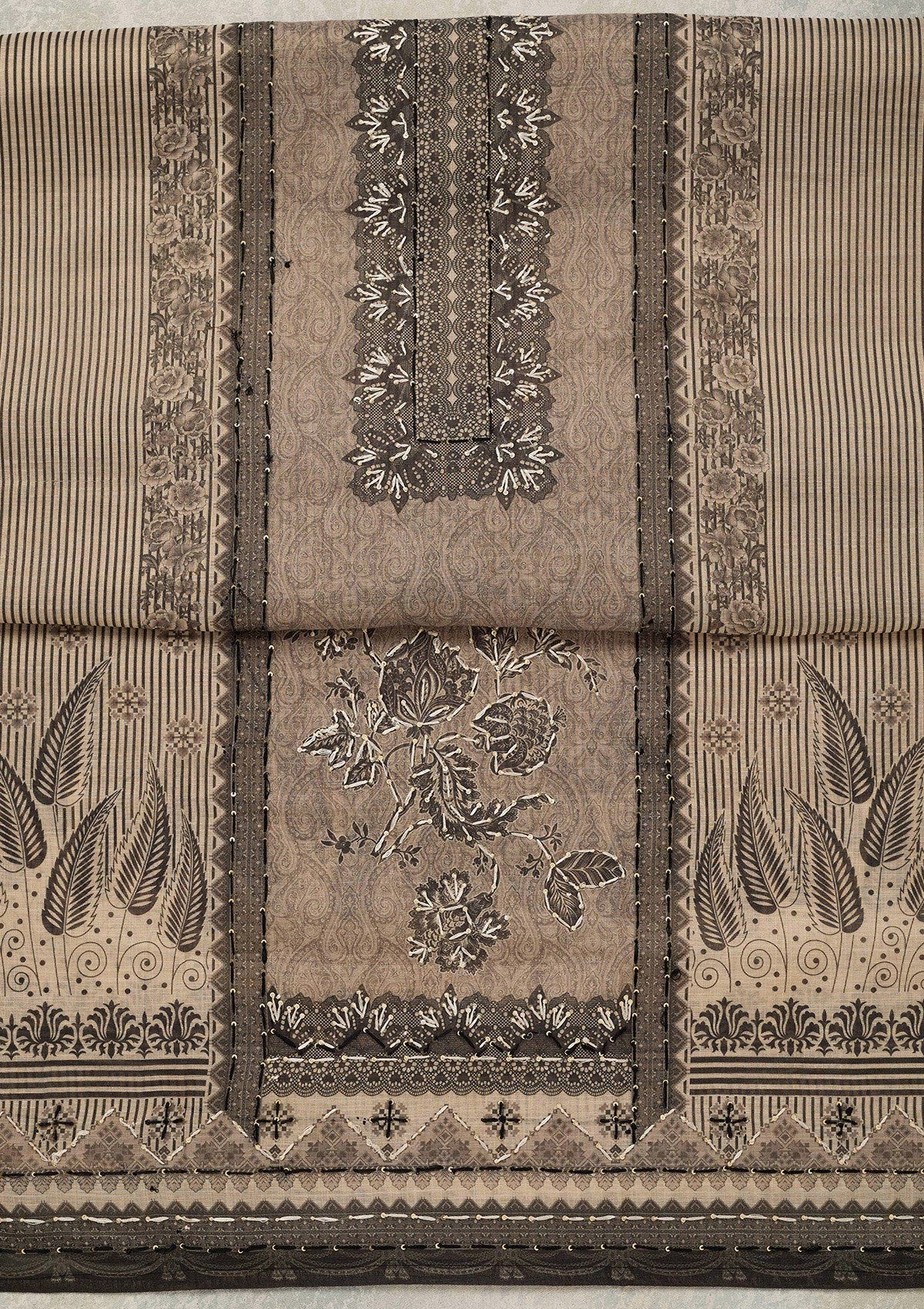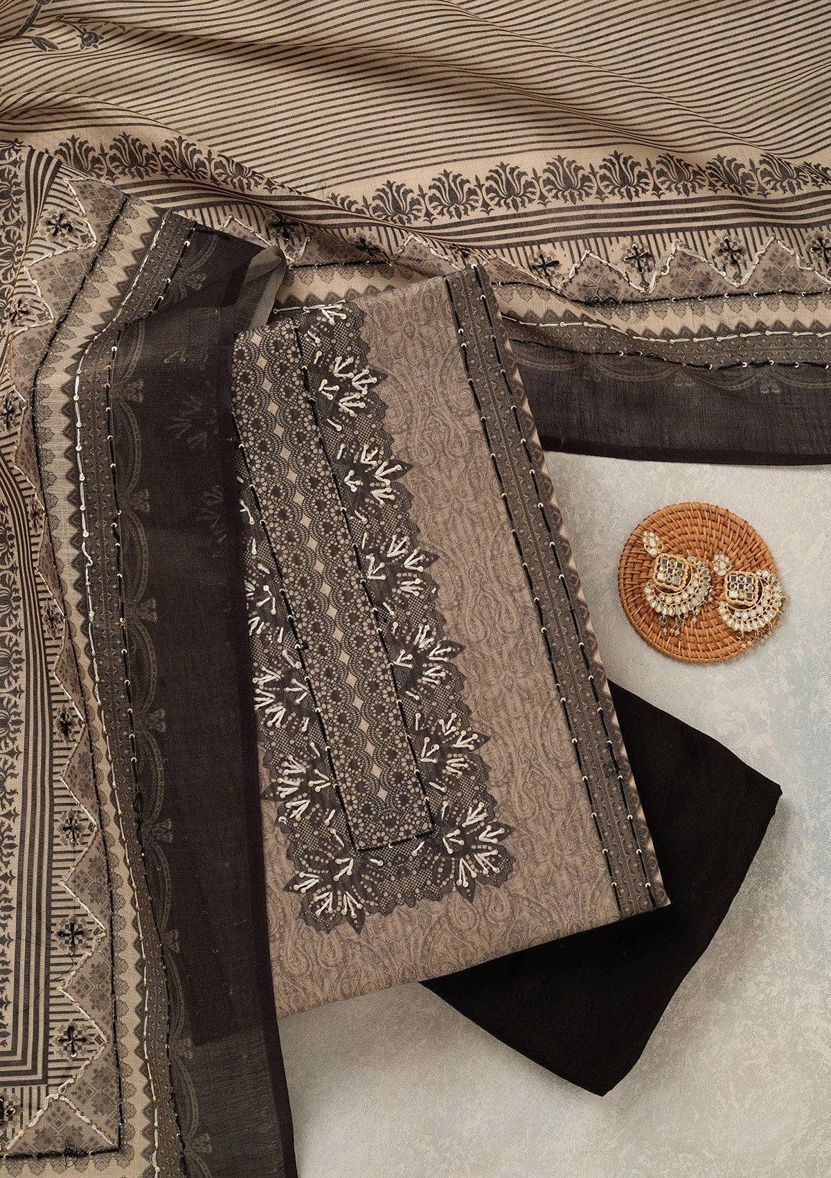 Beige Threadwork Chanderi Unstitched Salwar Suit