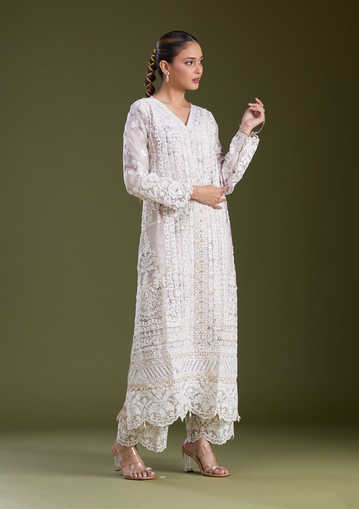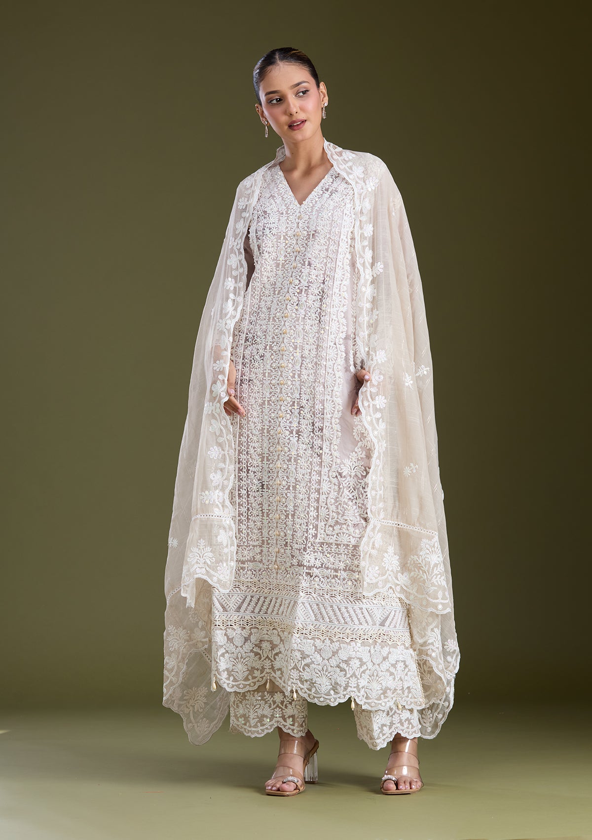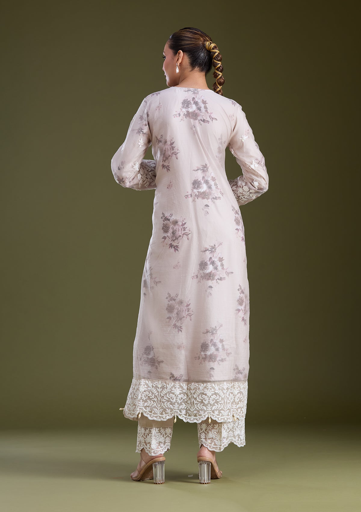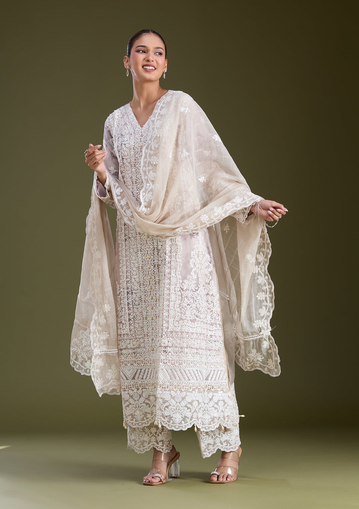 Beige Salwar_RM in Chanderi fabric. The Salwar_RM is embellished with Threadwork embroidery. Accompanied with a bottom and dupatta. Comes with the Koskii promise of premium quality.