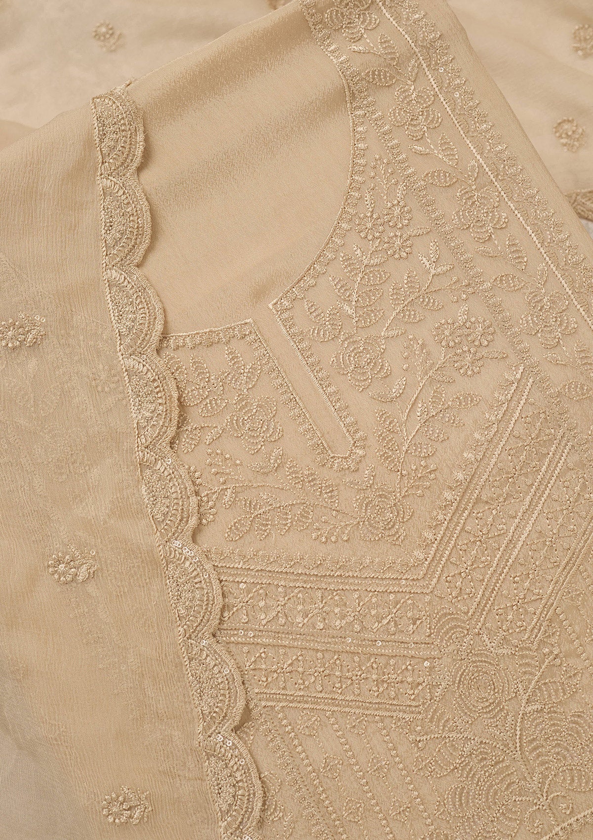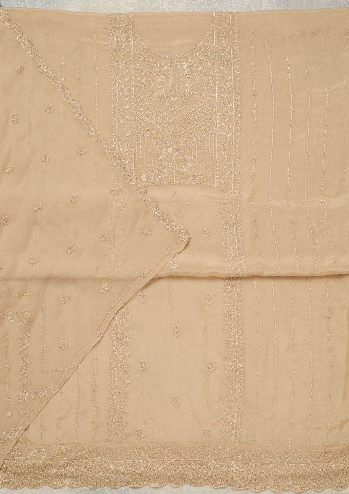 Beige Threadwork Chinon Unstitched Salwar Suit