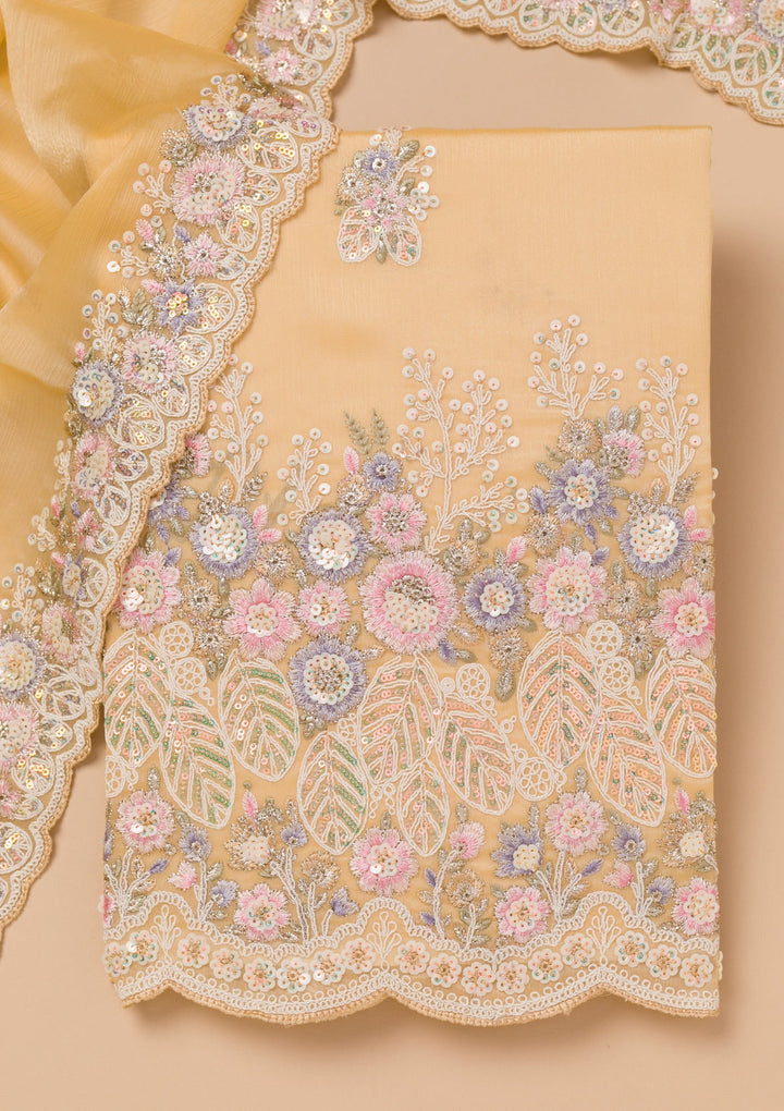 Dive into the world of elegance with Koskii's unstitched peach Salwar Suit, where luxurious Chinon fabric meets lively and spirited threadwork embroidery. This masterpiece is your canvas to unleash creativity, designed to flatter and flow with every movement. Perfect for those who adore crafting their unique style, it’s an expression of playful sophistication waiting to twirl at any celebration!.