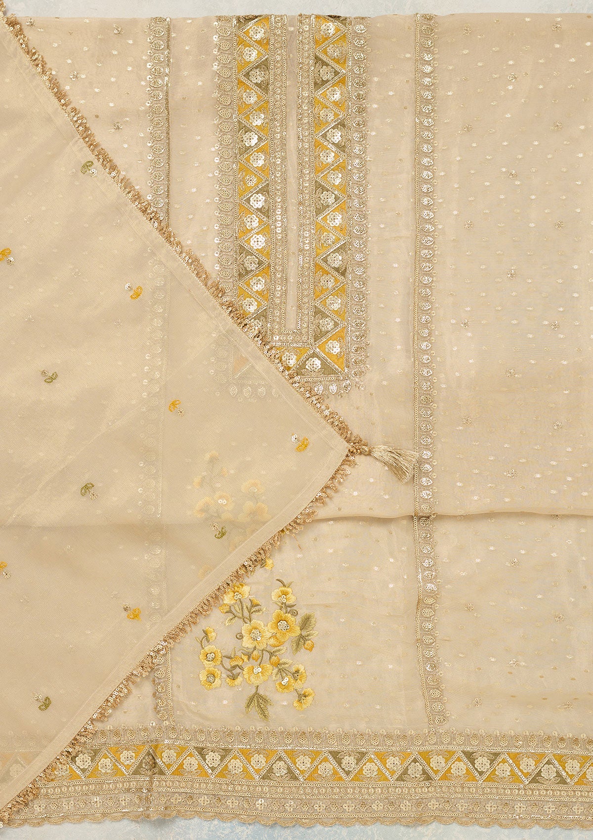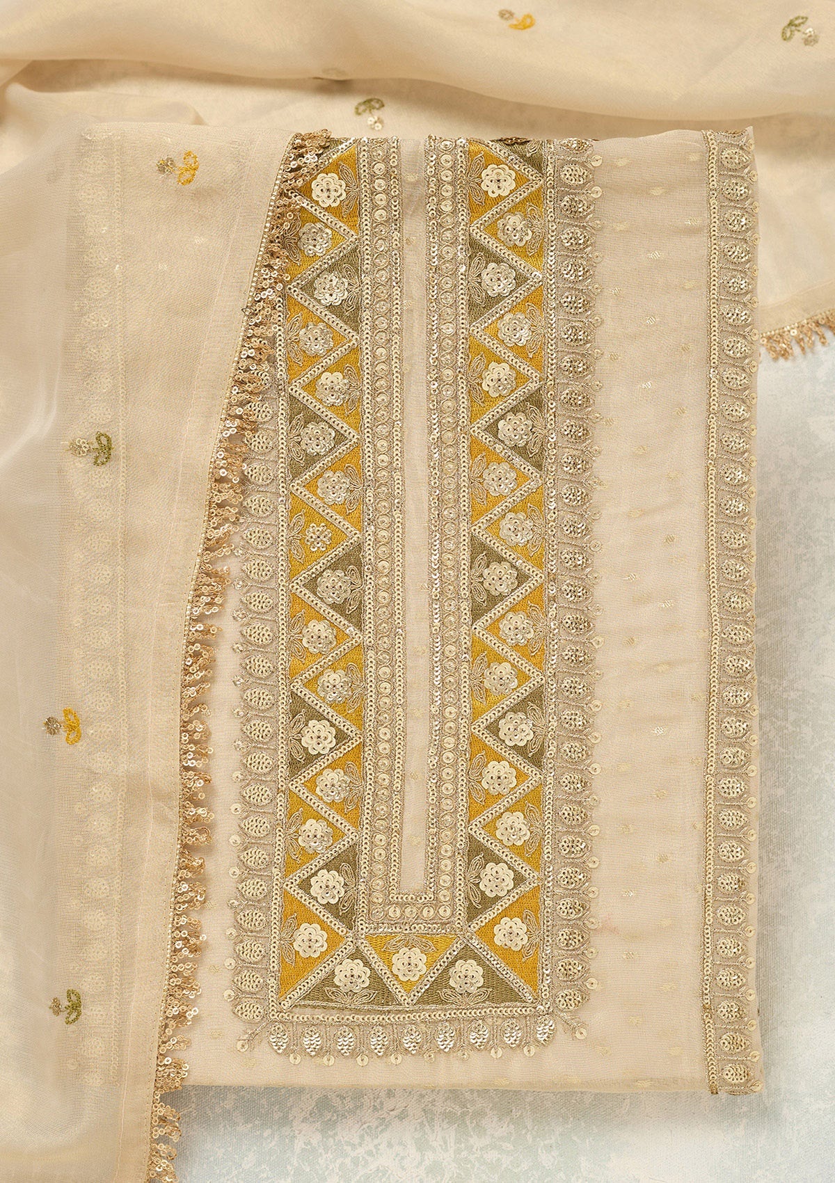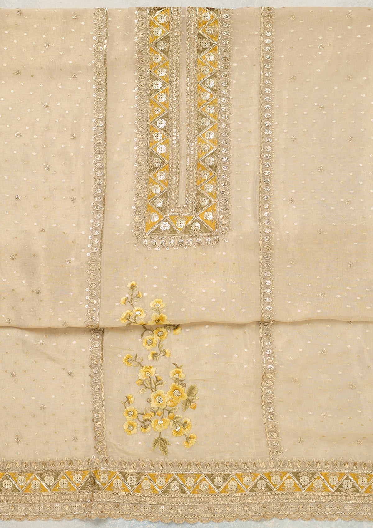 Beige Threadwork Tissue Unstitched Salwar Suit