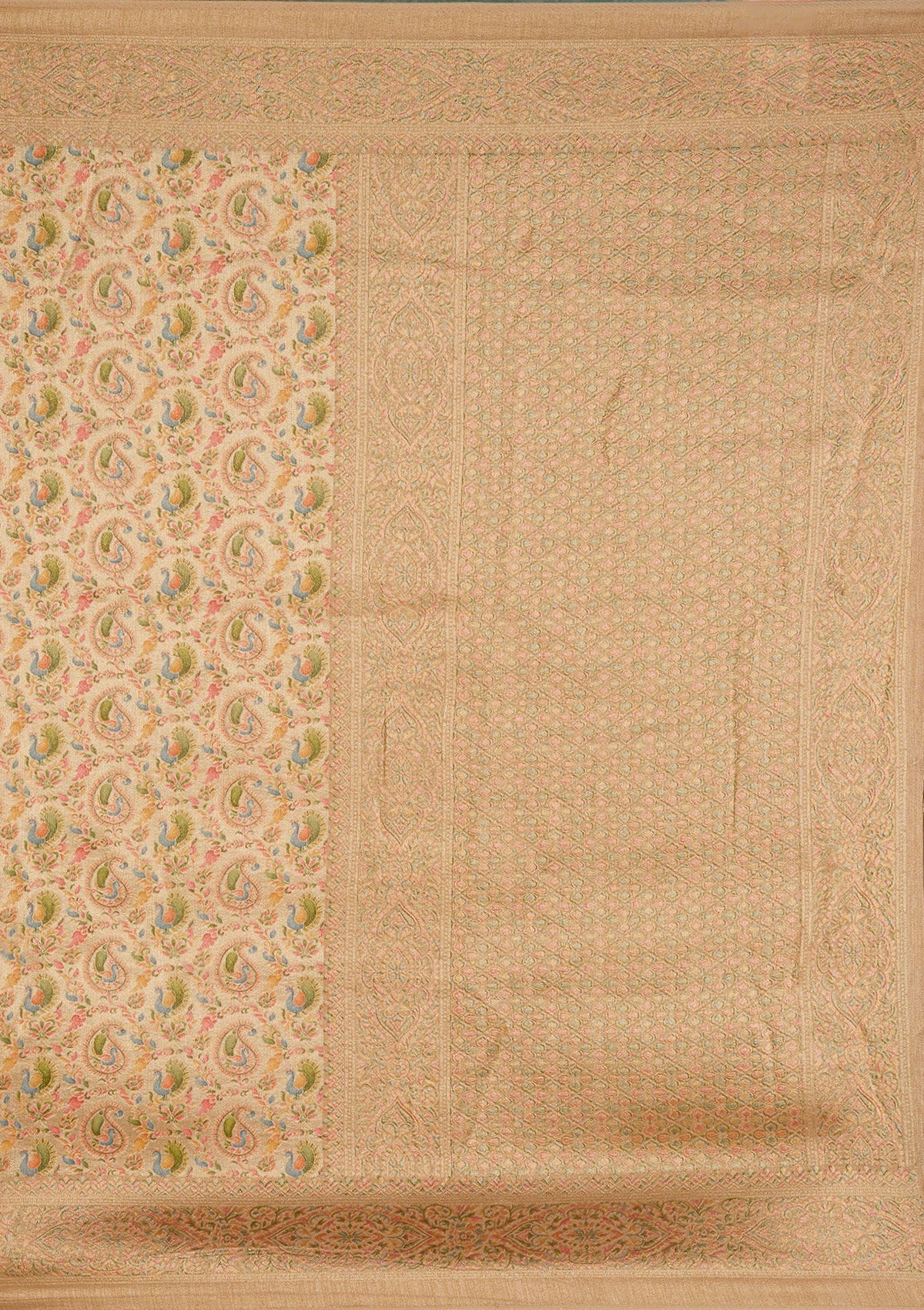 Beige Silk_Saree in Art Silk fabric. The Silk_Saree is elevated with Zariwork (Gold) embroidery. It comes with an Unstitched blouse. Comes with the Koskii promise of premium quality.