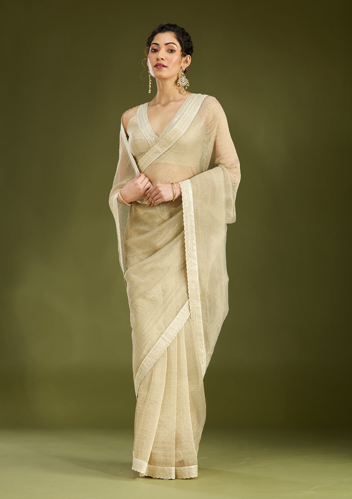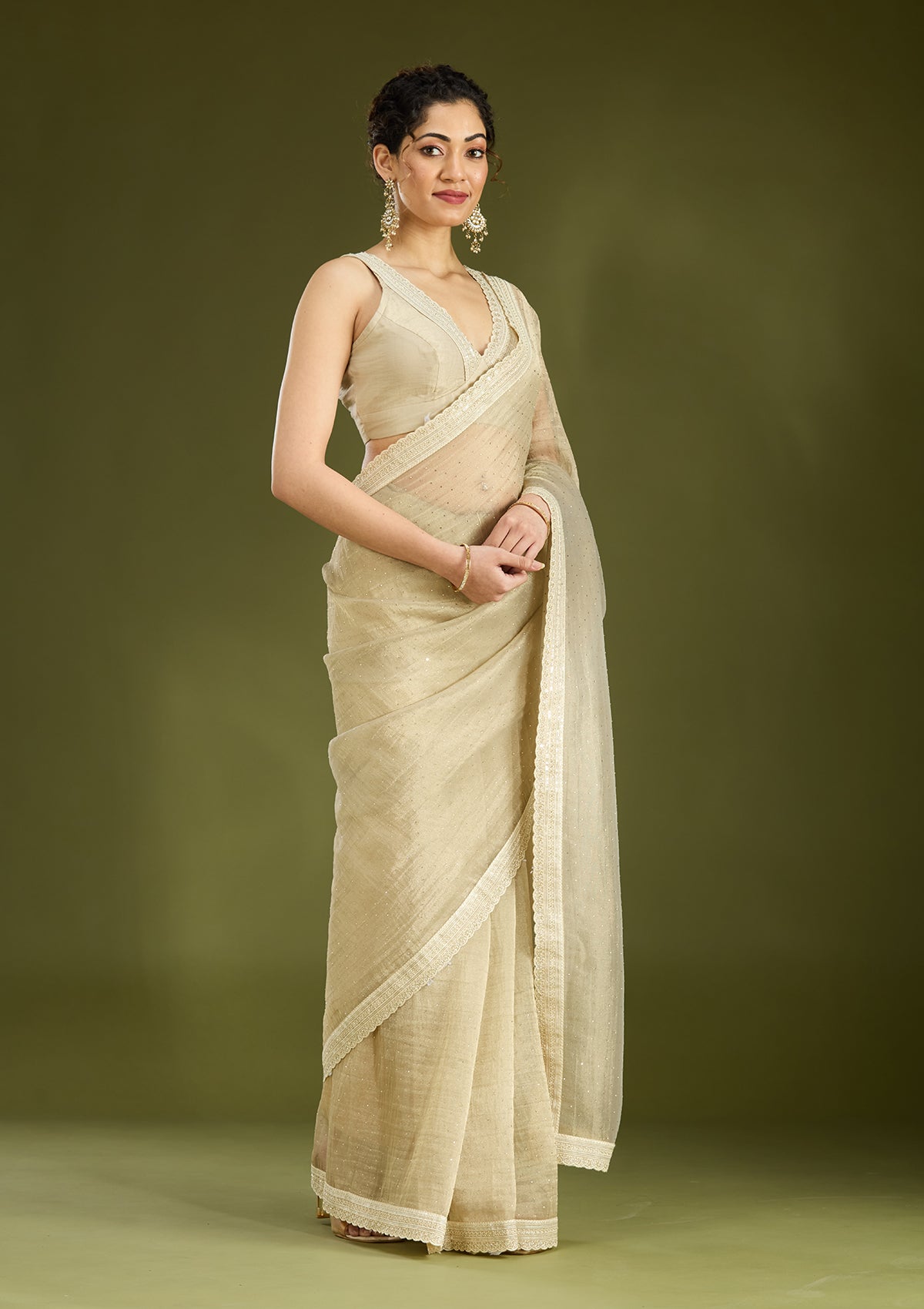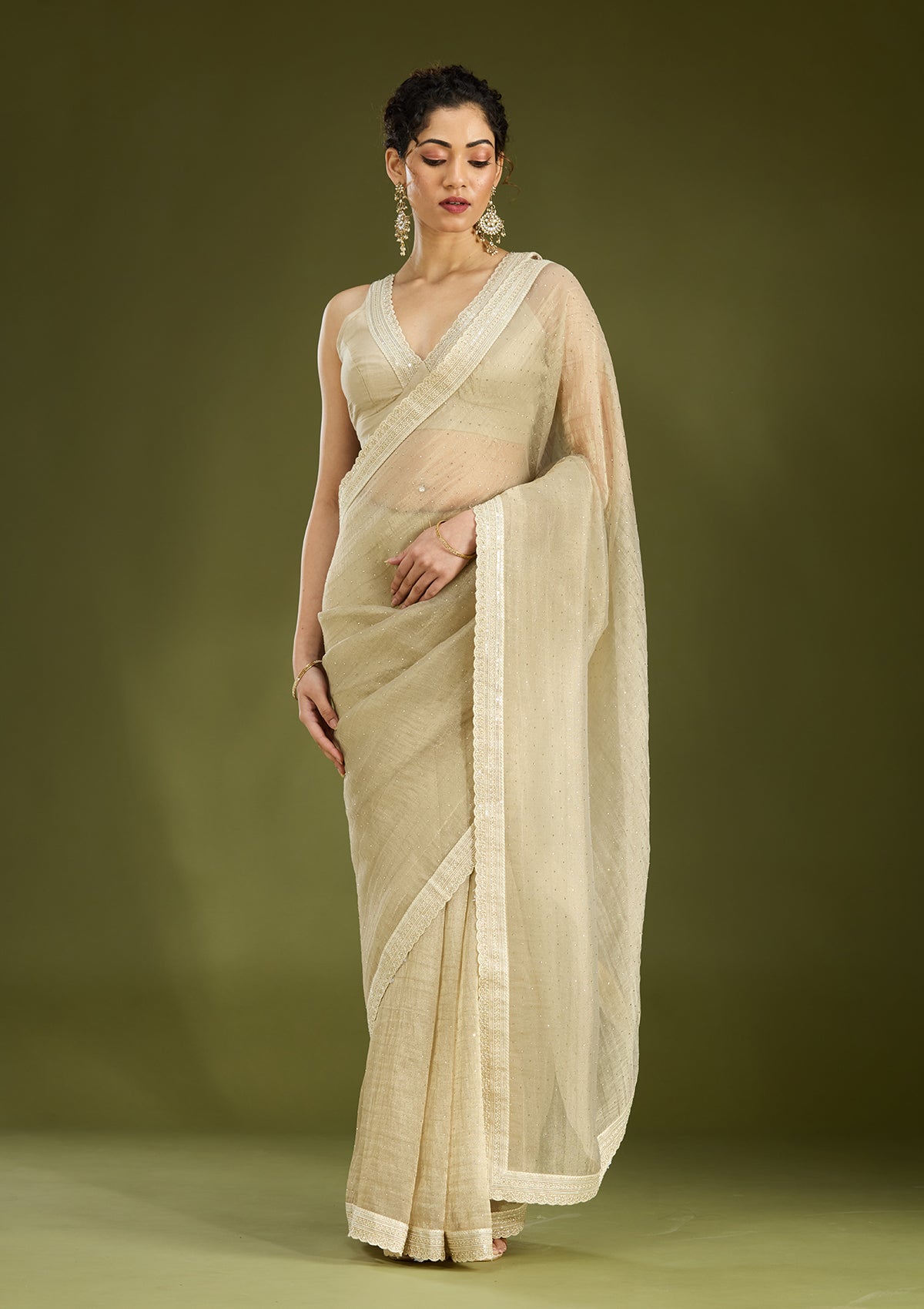 Beige Saree in Tissue fabric. The Saree is elevated with Zariwork (Gold) embroidery. It comes with an Unstitched blouse. Comes with the Koskii promise of premium quality.