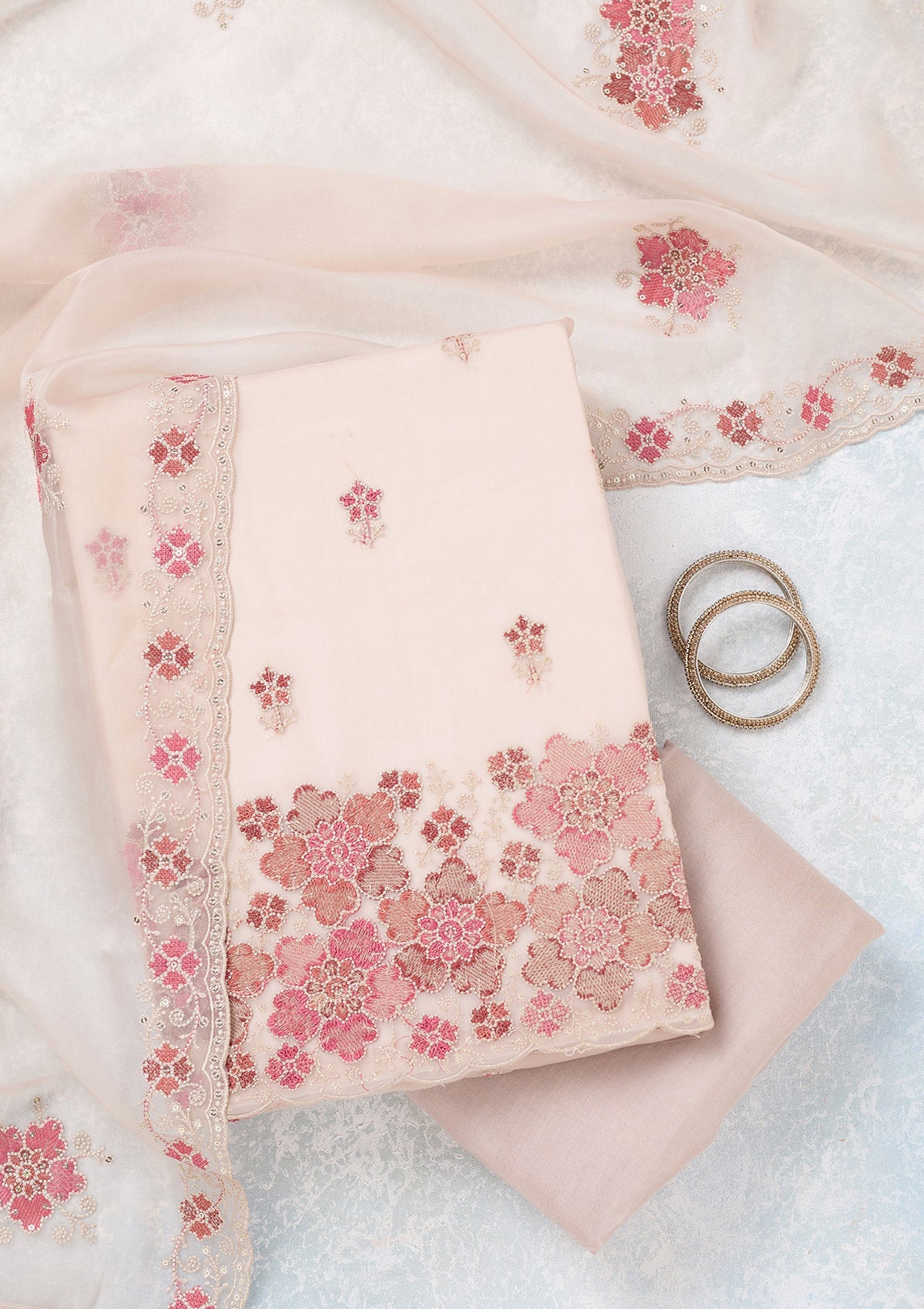 Beige Zariwork Organza Unstitched Salwar Suit
