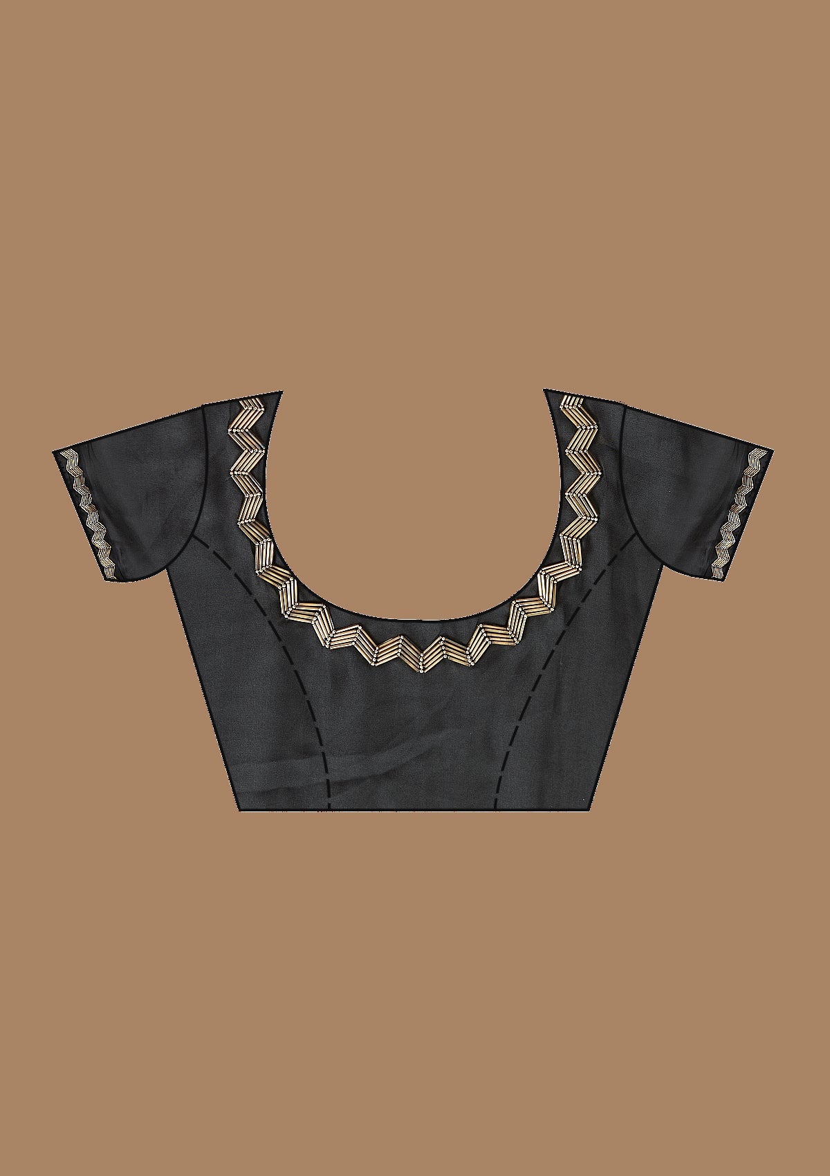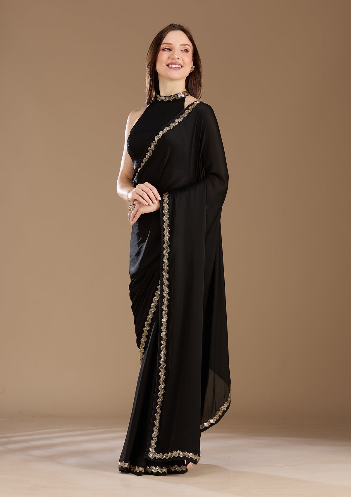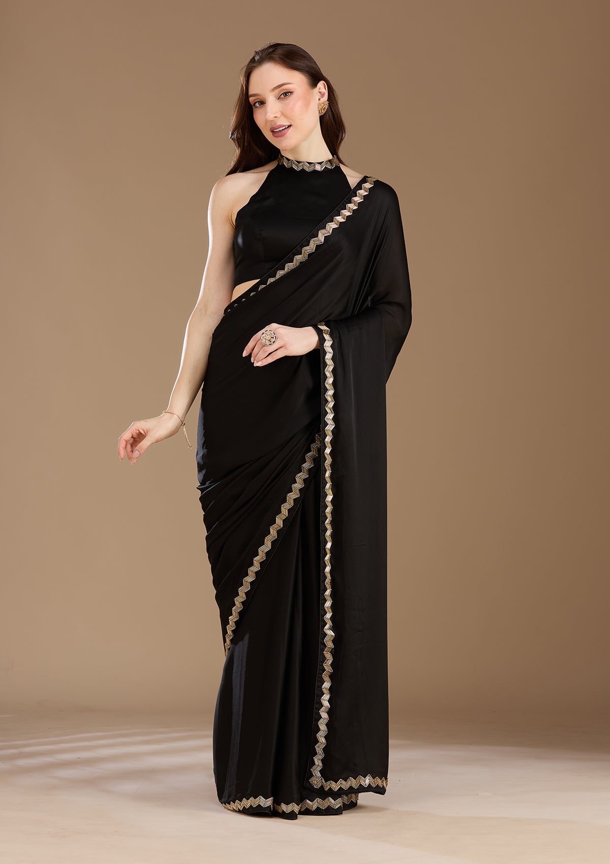 Black Saree in Satin fabric. The Saree is elevated with Aariwork embroidery. It comes with an Unstitched blouse. Comes with the Koskii promise of premium quality.
