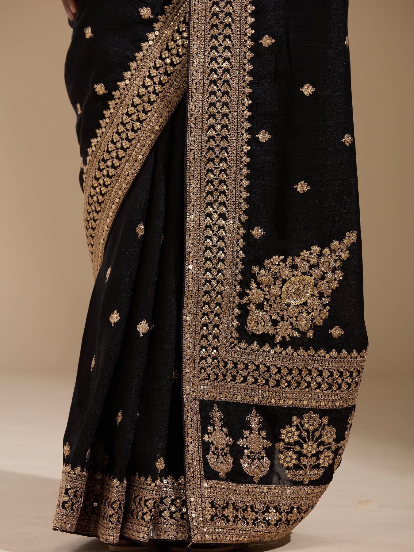 Black Saree in Soft Raw Silk fabric. The Saree is elevated with Cording embroidery. It comes with an Unstitched blouse. Comes with the Koskii promise of premium quality.