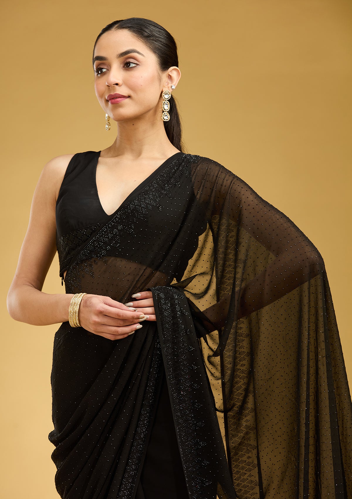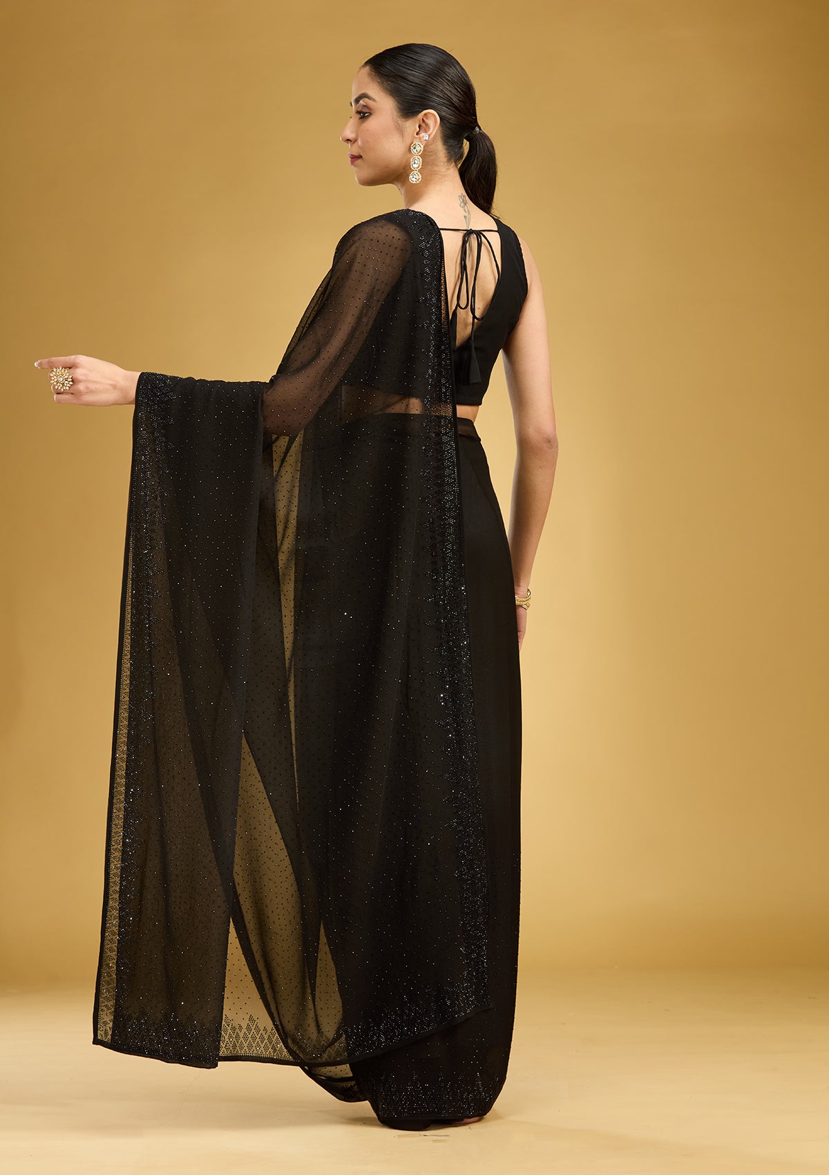 Black Saree in Georgette fabric. The Saree is elevated with Swarovski embroidery. It comes with an Unstitched blouse. Comes with the Koskii promise of premium quality.