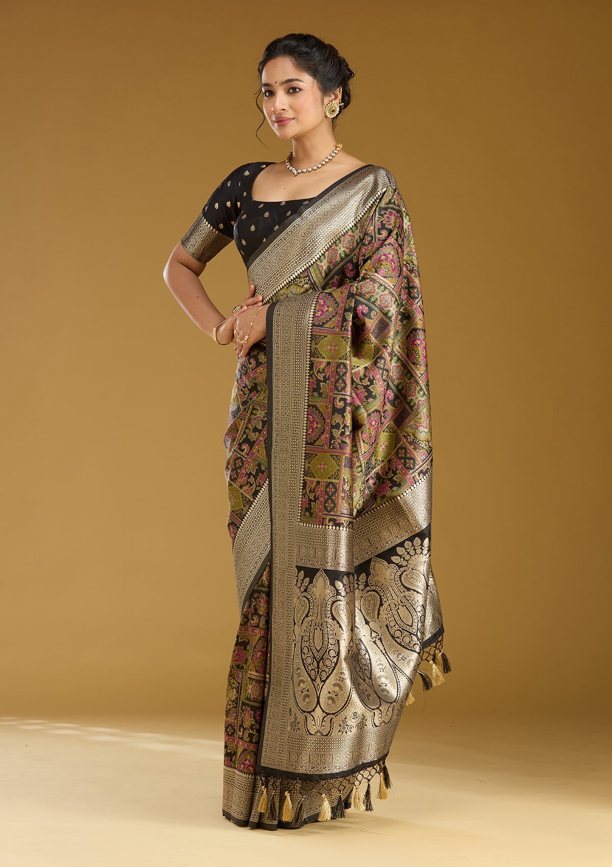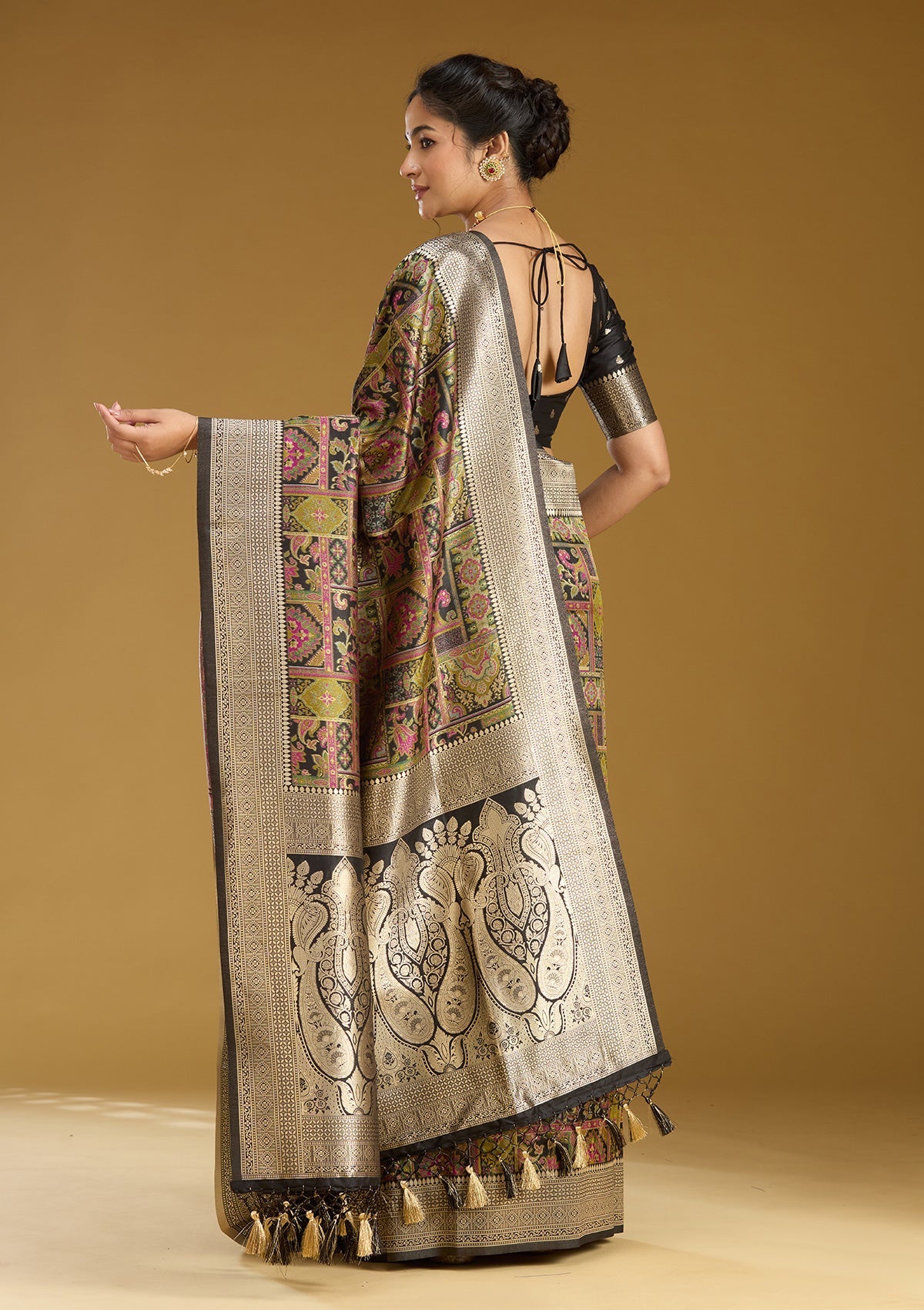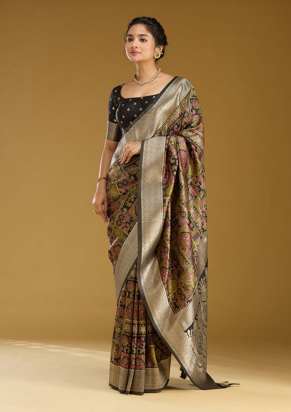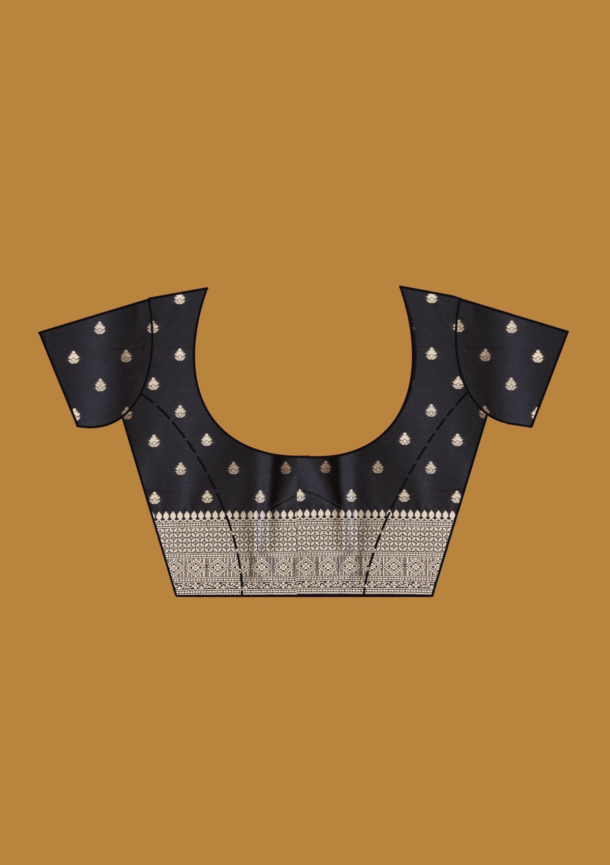 Black Silk_Saree in Art Silk fabric. The Silk_Saree is elevated with Zariwork (Silver) embroidery. It comes with an Unstitched blouse. Comes with the Koskii promise of premium quality.