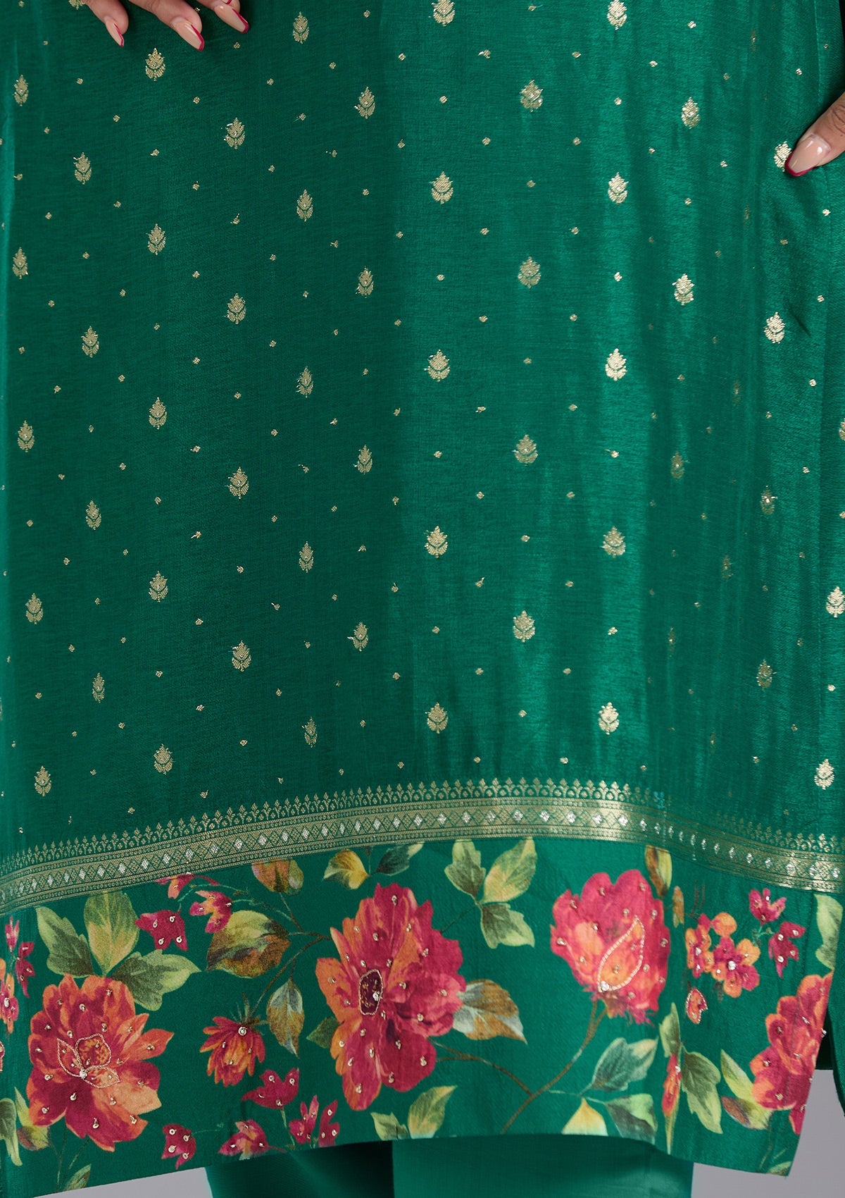Bottle Green Salwar Suit in Soft Raw Silk fabric The Salwar Suit is embellished with Sequins embroidery Accompanied with a bottom and dupatta Comes with the Koskii promise of premium quality.