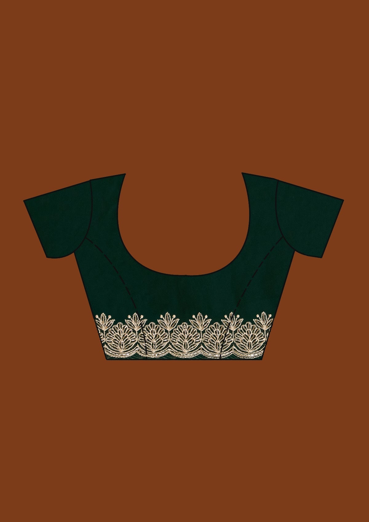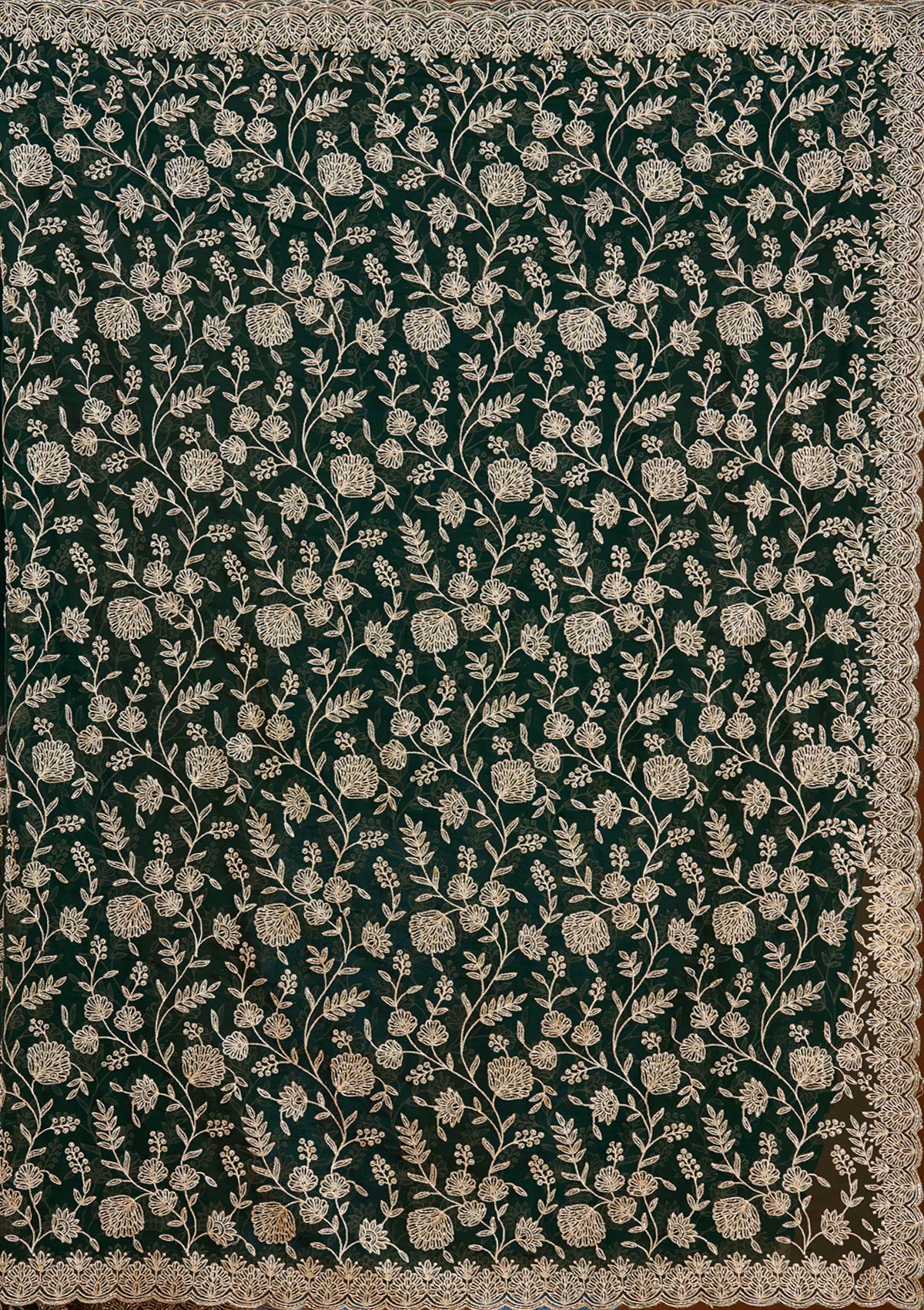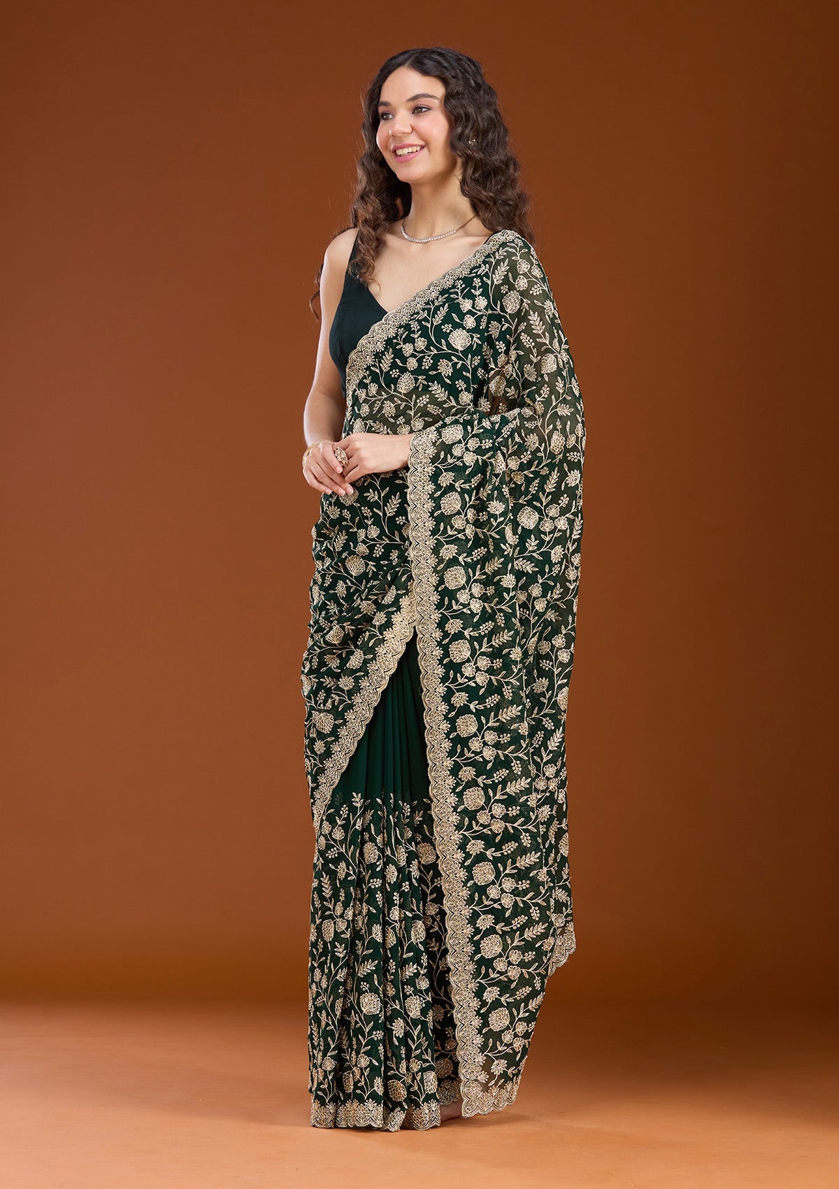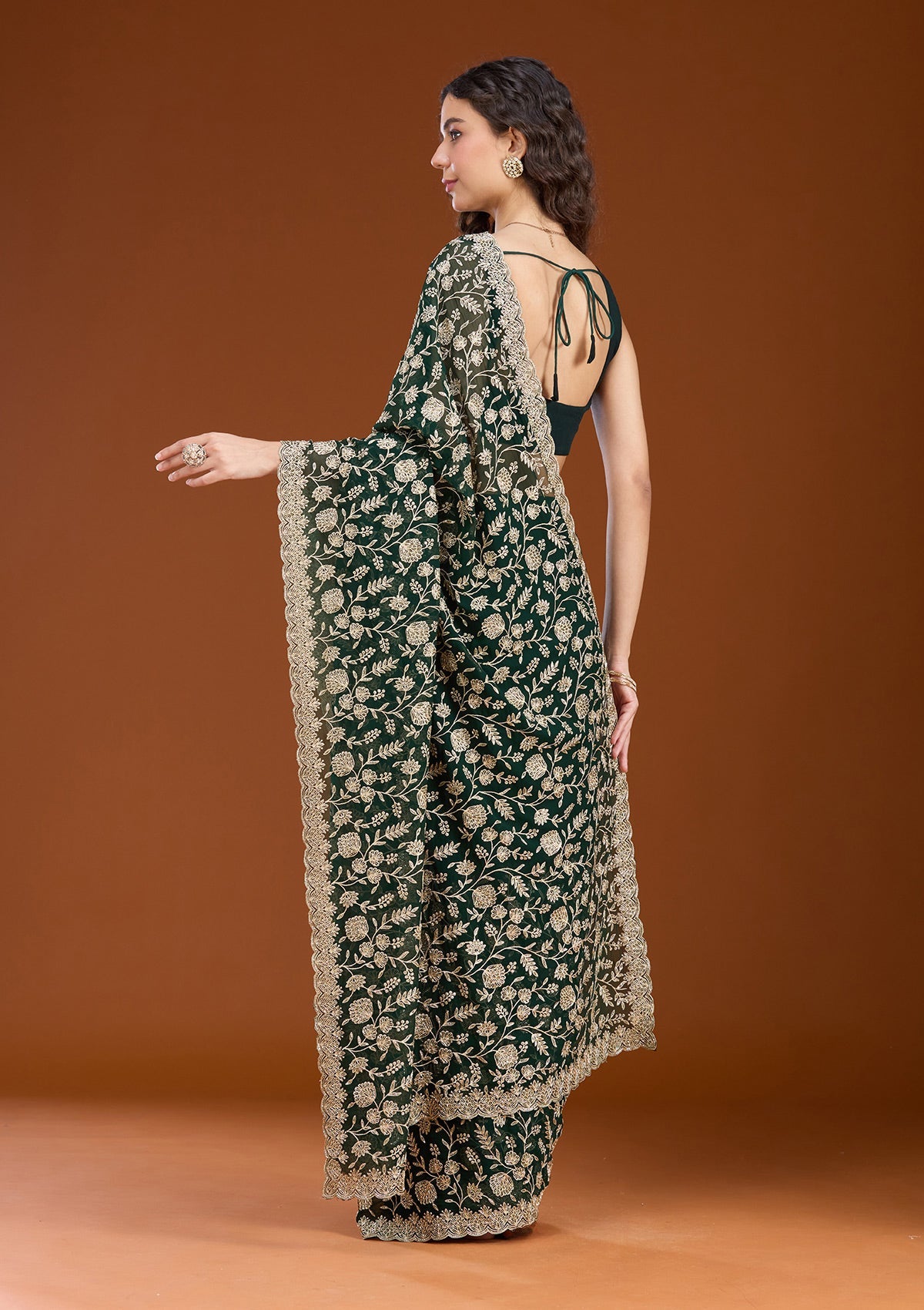 Bottle Green Saree in Georgette fabric. The Saree is elevated with Zariwork (Gold) embroidery. It comes with an Unstitched blouse. Comes with the Koskii promise of premium quality.