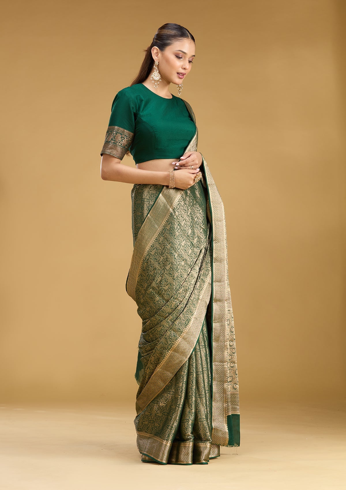 Bottle Green Silk_Saree in Georgette fabric. The Silk_Saree is elevated with Zariwork (Gold) embroidery. It comes with an Unstitched blouse. Comes with the Koskii promise of premium quality.