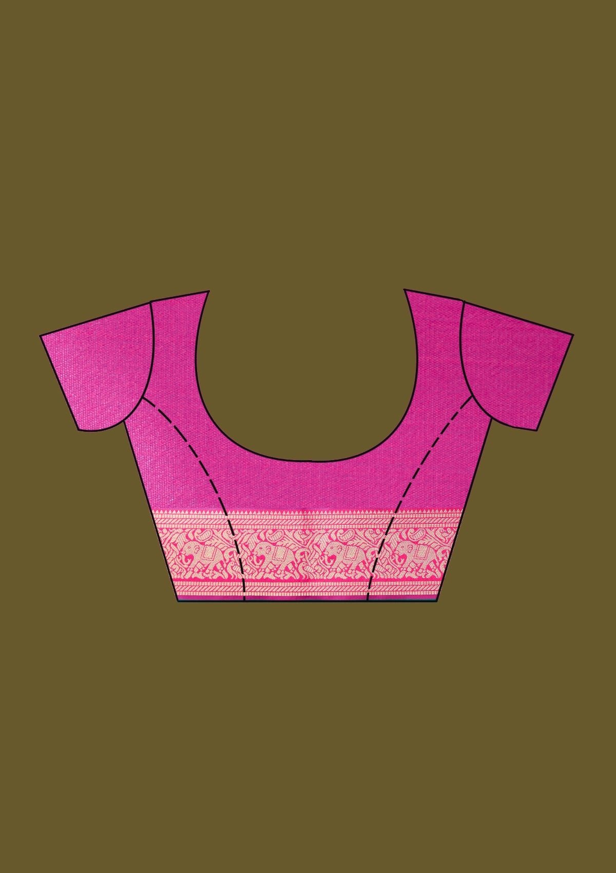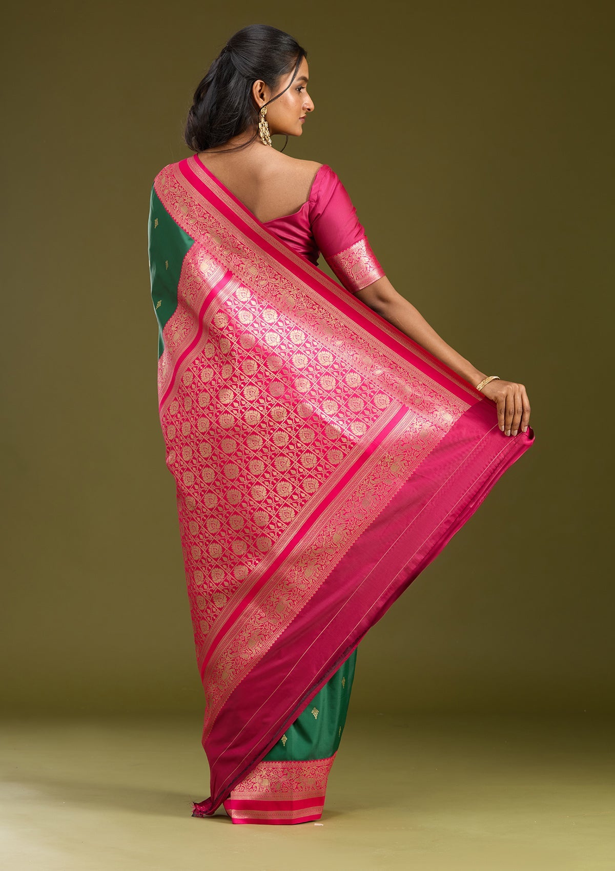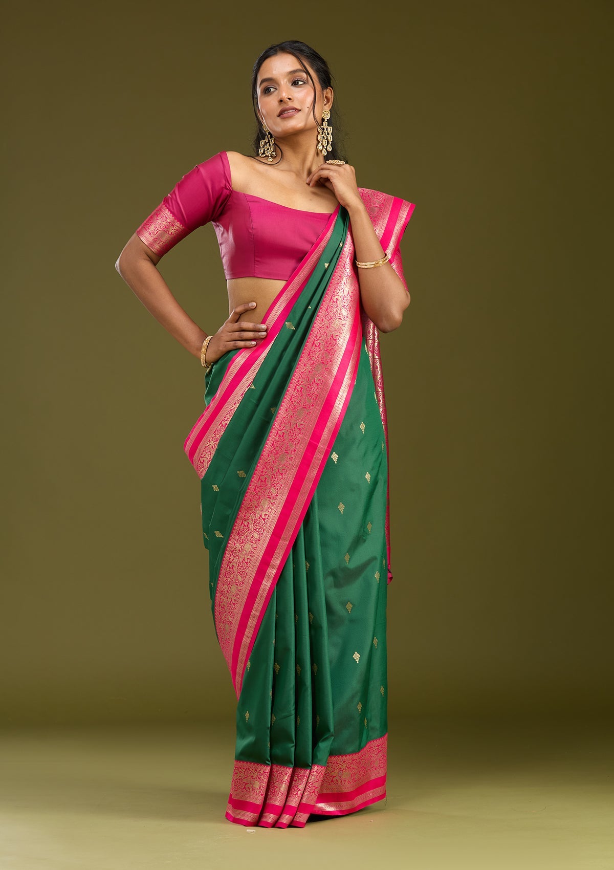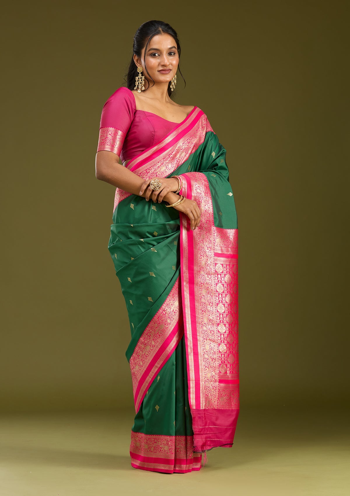 Bottle Green Silk_Saree in Silk fabric. The Silk_Saree is elevated with Zariwork (Gold) embroidery. It comes with an Unstitched blouse. Comes with the Koskii promise of premium quality.