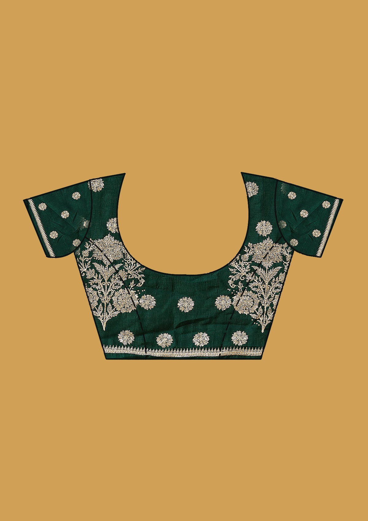 Bottle Green Saree in Soft Raw Silk fabric. The Saree is elevated with Zariwork (Gold) embroidery. It comes with an Unstitched blouse. Comes with the Koskii promise of premium quality.
