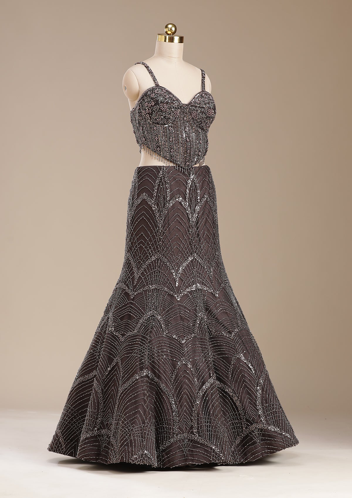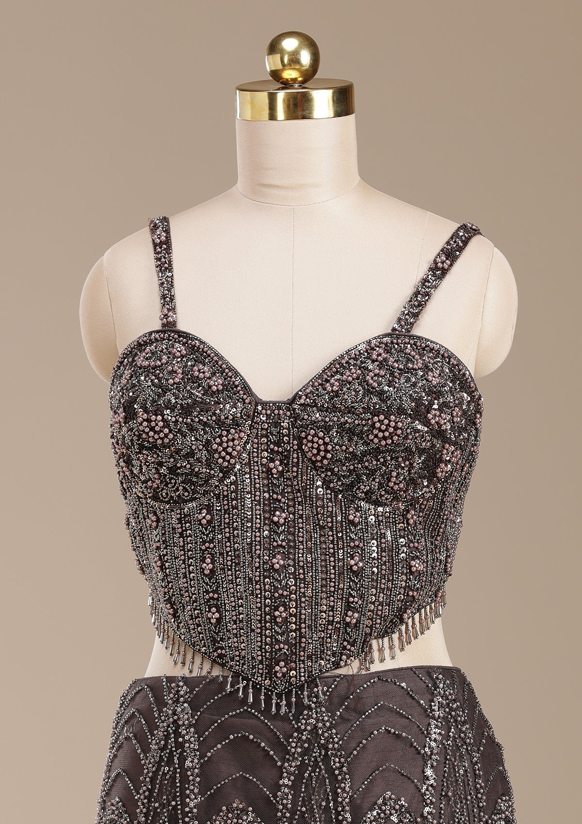 Brown Readymade Lehenga in Net fabric. The Lehenga is embellished with Cutdana embroidery. Accompanied with an Readymade blouse and dupatta. Comes with the Koskii promise of premium quality.