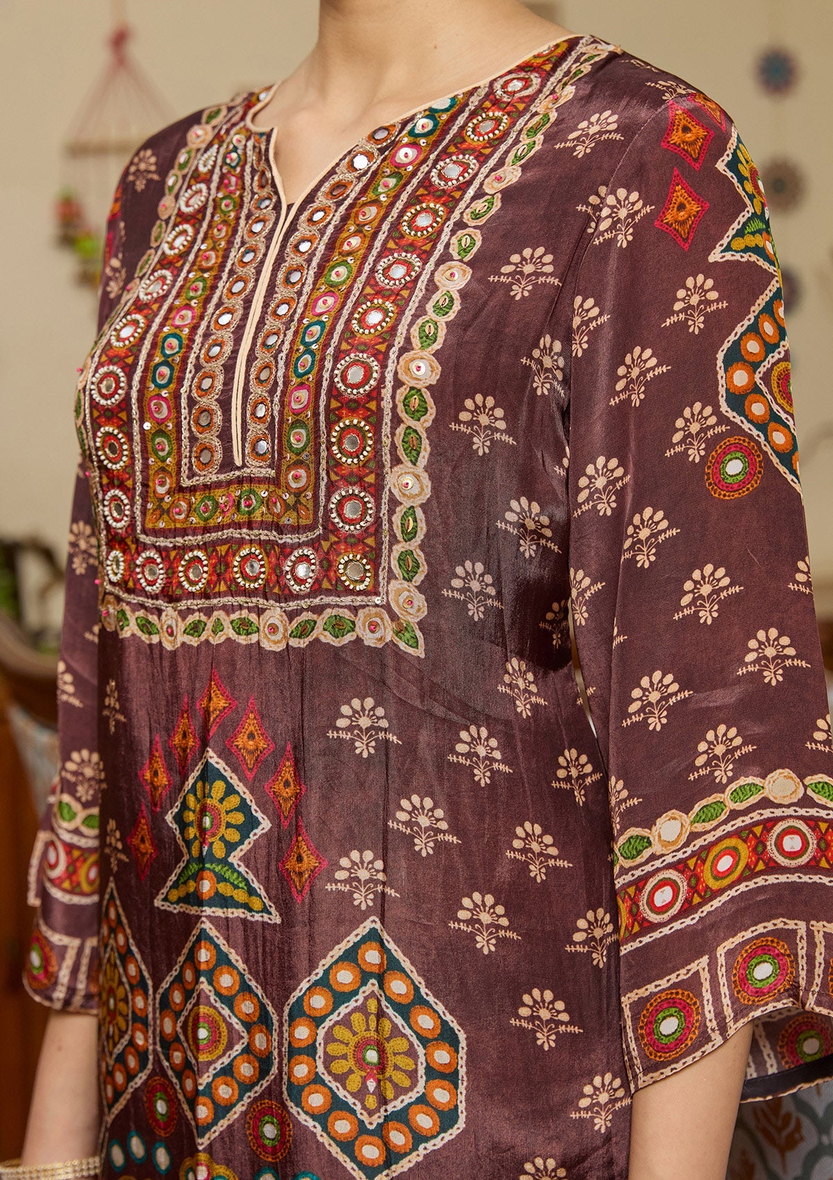 Brown Salwar Suit in Crepe fabric. The Salwar Suit is embellished with Mirrorwork embroidery. Accompanied with a bottom and dupatta. Comes with the Koskii promise of premium quality.