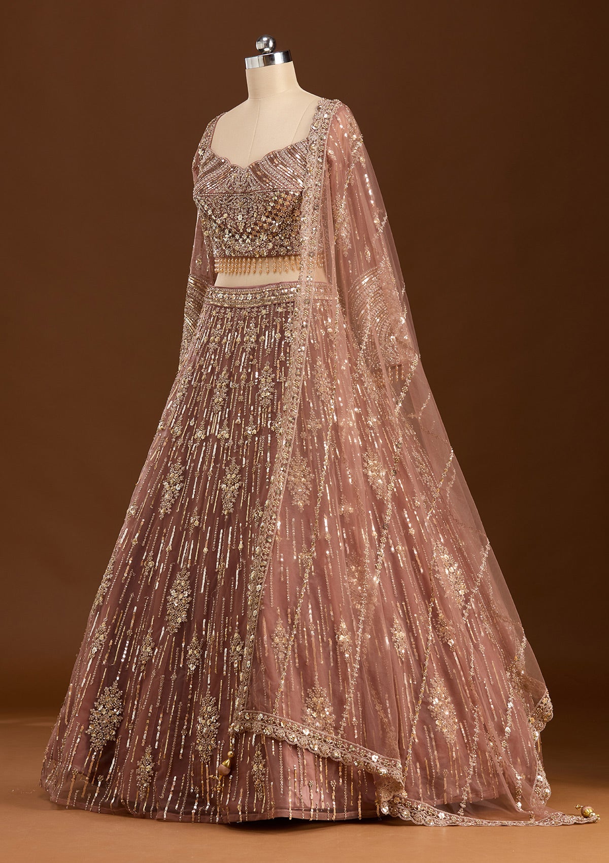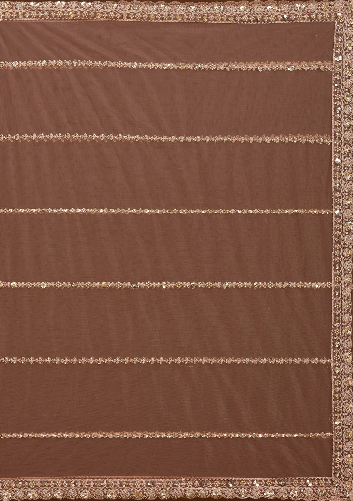 Brown Readymade Lehenga in Net fabric. The Lehenga is embellished with Sequins embroidery. Accompanied with an Readymade blouse and dupatta. Comes with the Koskii promise of premium quality.