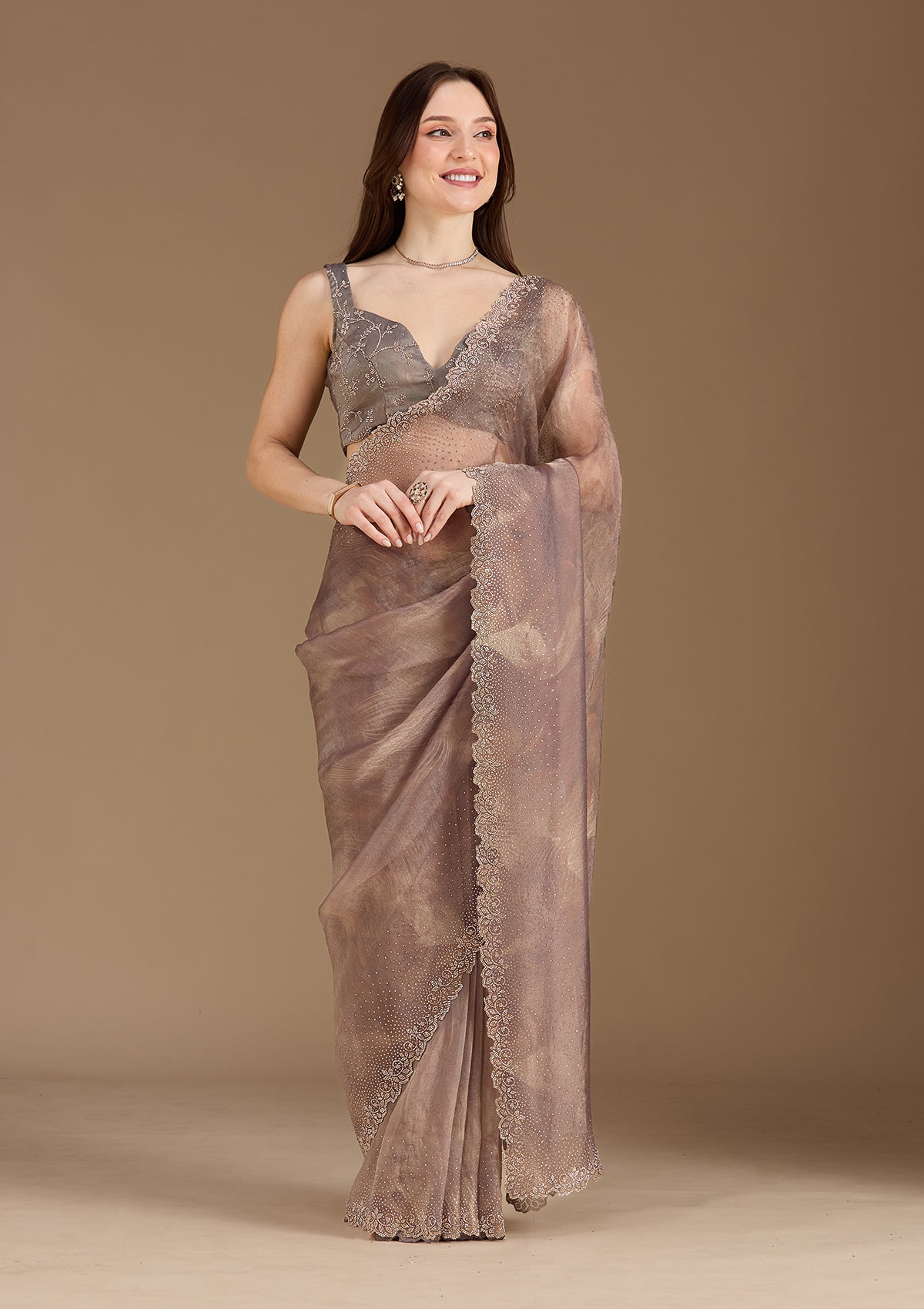 Brown Saree in Tissue fabric. The Saree is elevated with Stonework (Gold) embroidery. It comes with an Unstitched blouse. Comes with the Koskii promise of premium quality.
