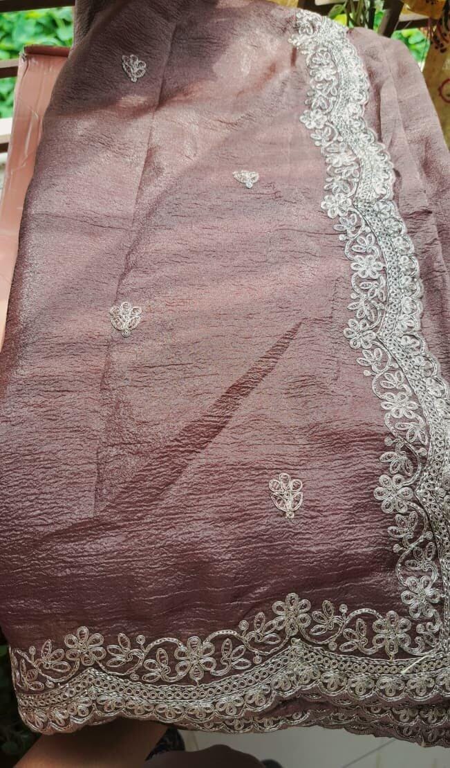 Brown Saree in Tissue fabric. The Saree is elevated with Zariwork (Gold) embroidery. It comes with an Unstitched blouse. Comes with the Koskii promise of premium quality.