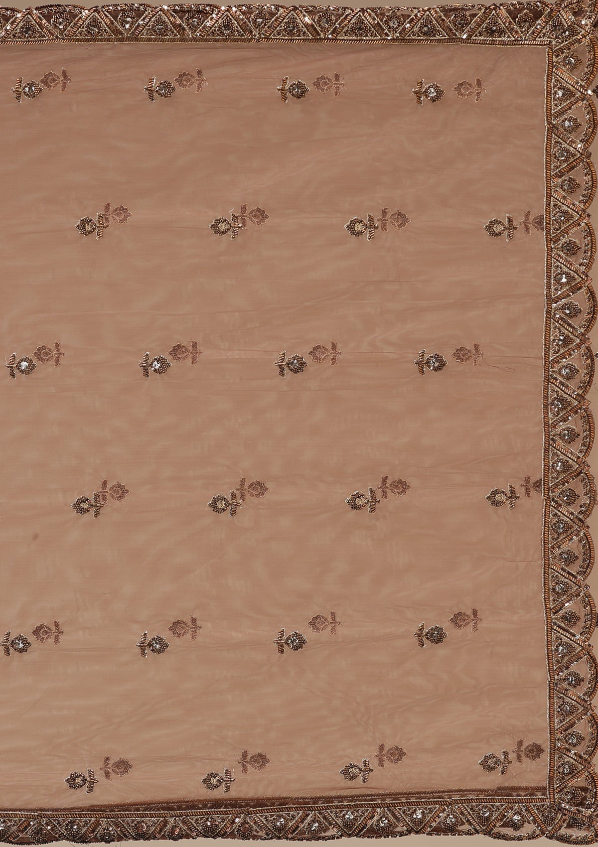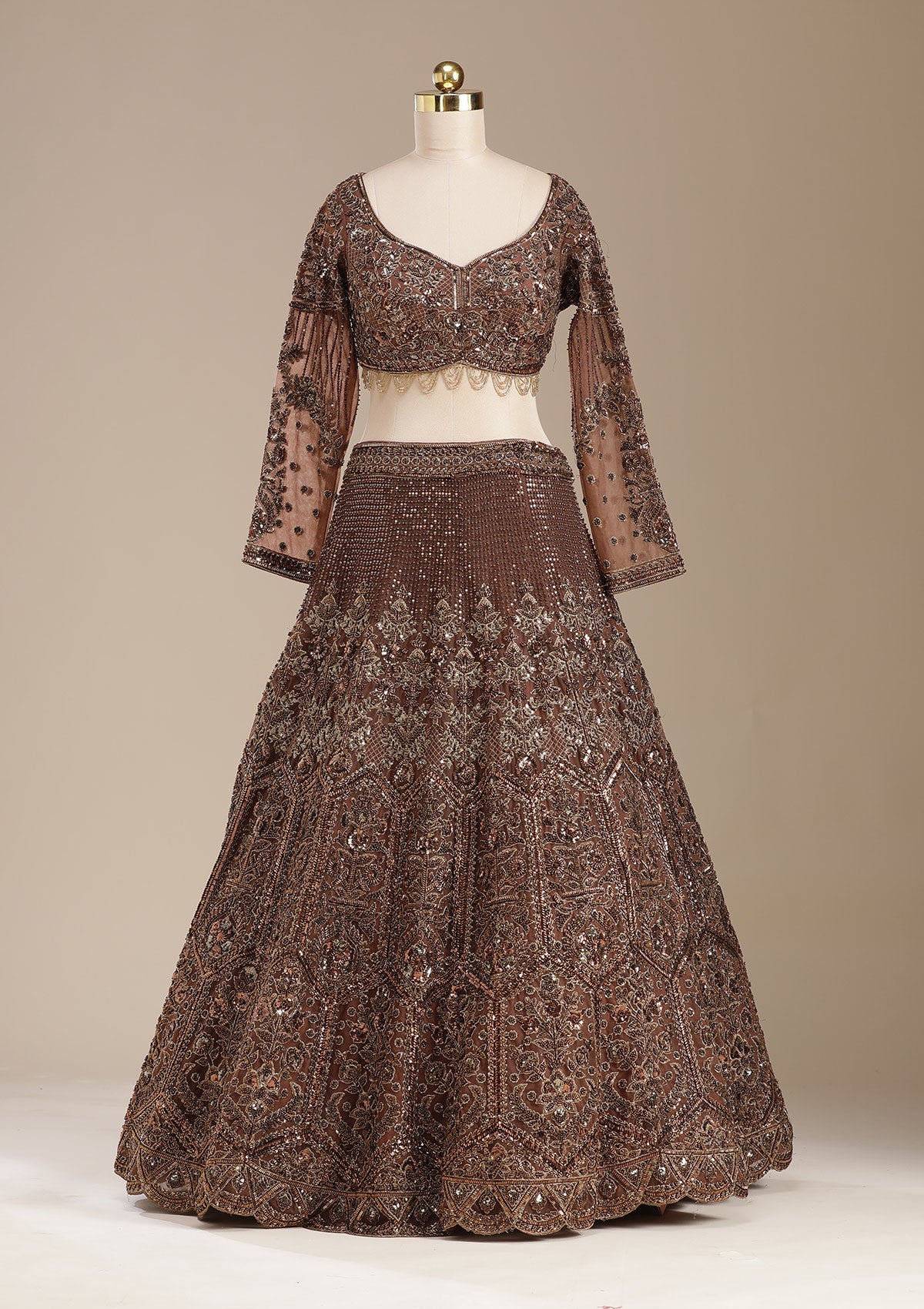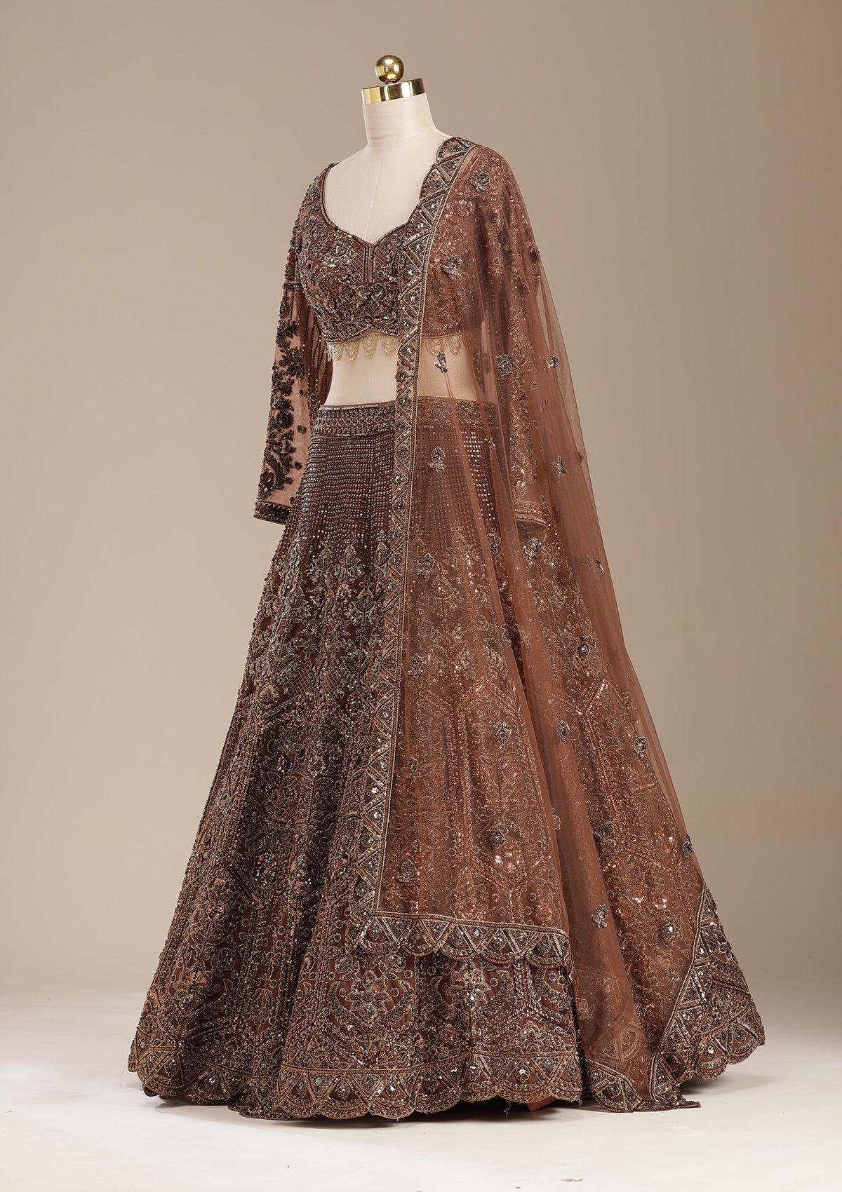 Copper Readymade Lehenga in Net fabric. The Lehenga is embellished with Cutdana embroidery. Accompanied with an Readymade blouse and dupatta. Comes with the Koskii promise of premium quality.