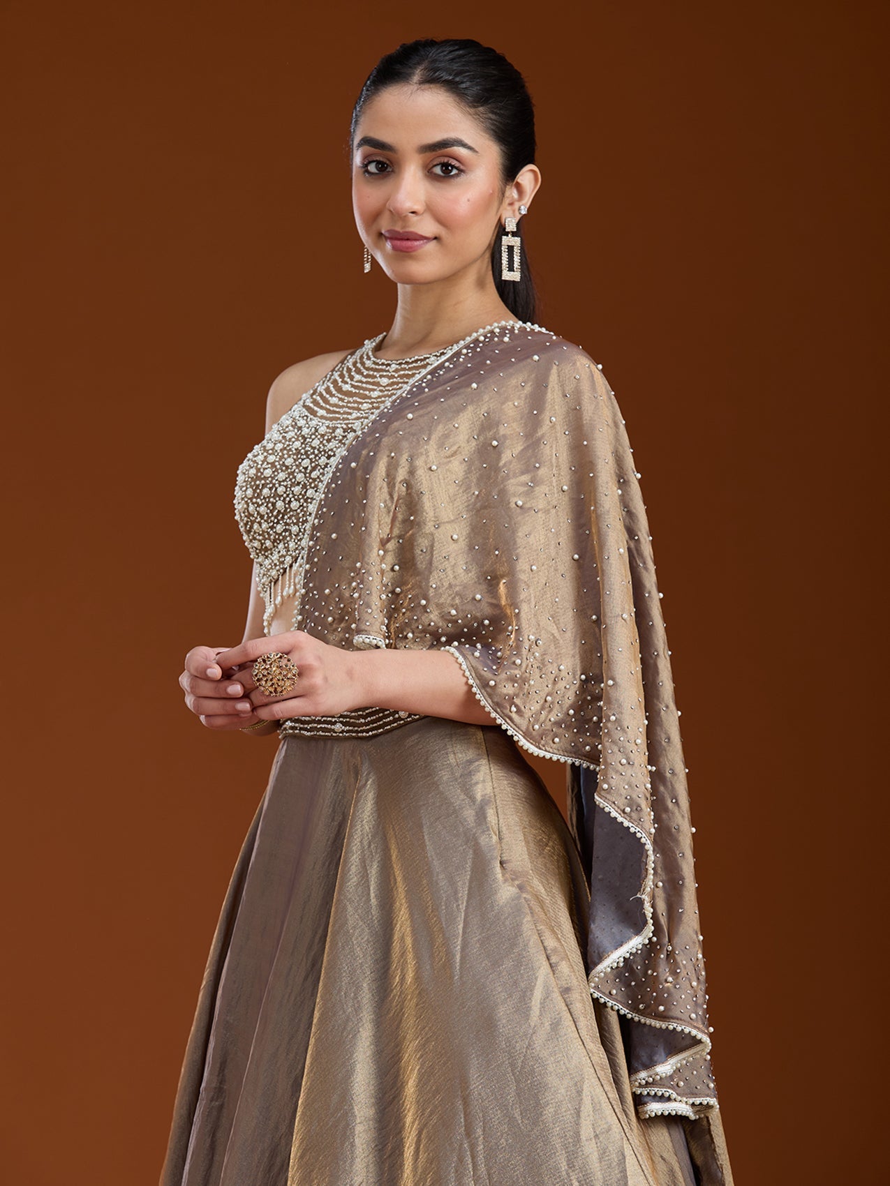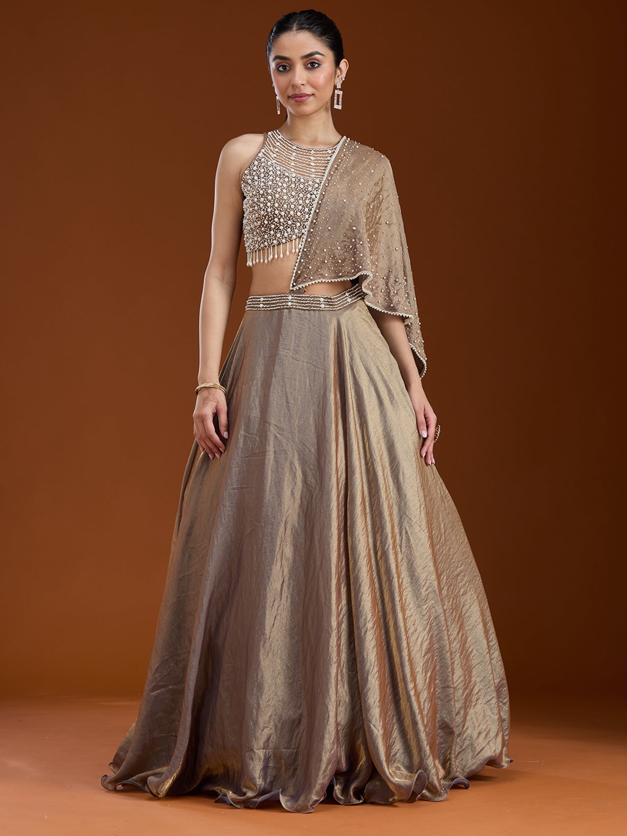 Copper Readymade Lehenga in Organza fabric. The Lehenga is embellished with Pearlwork embroidery. Accompanied with an Readymade blouse and dupatta. Comes with the Koskii promise of premium quality.