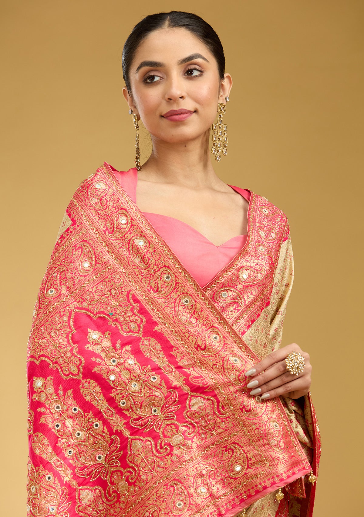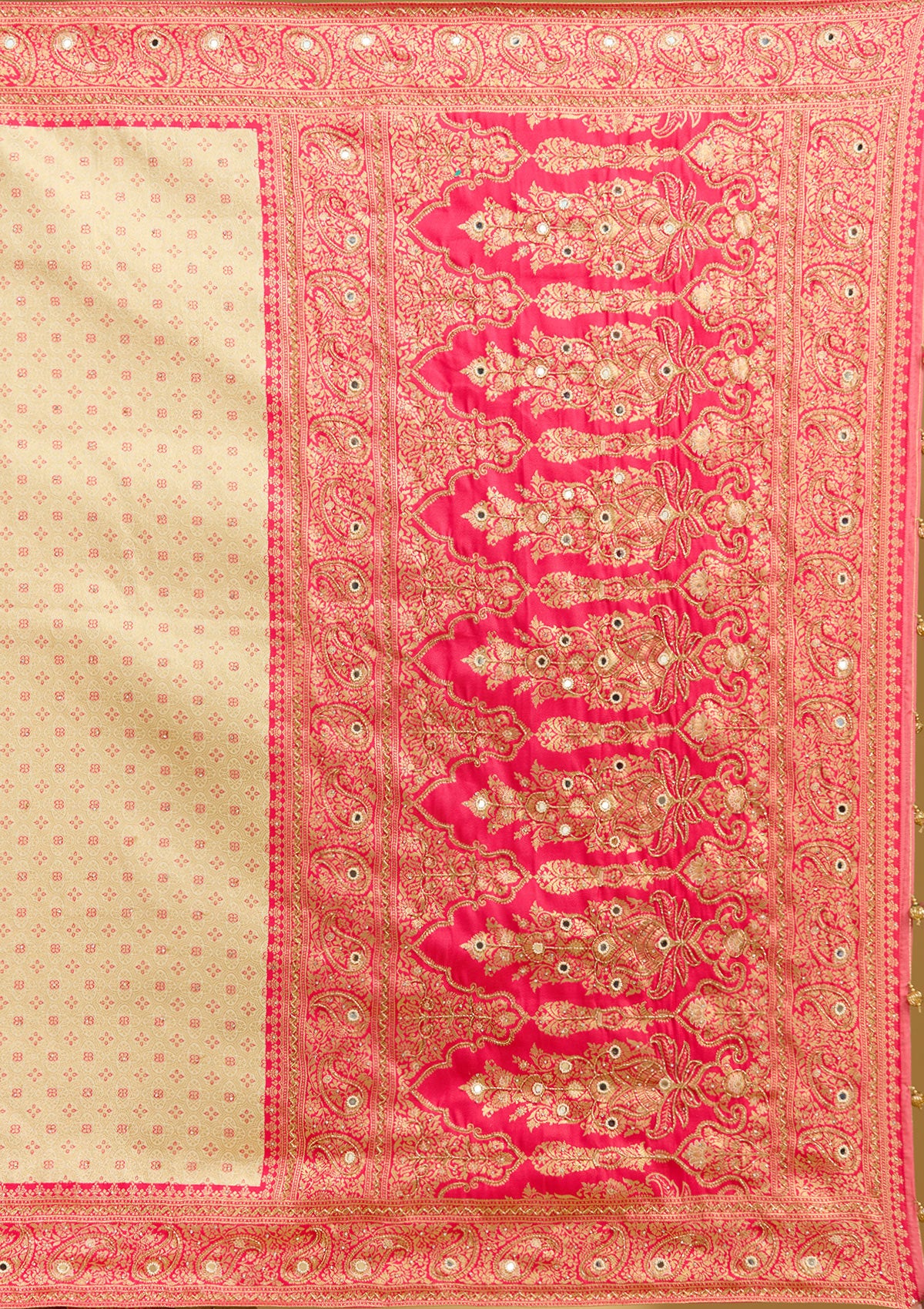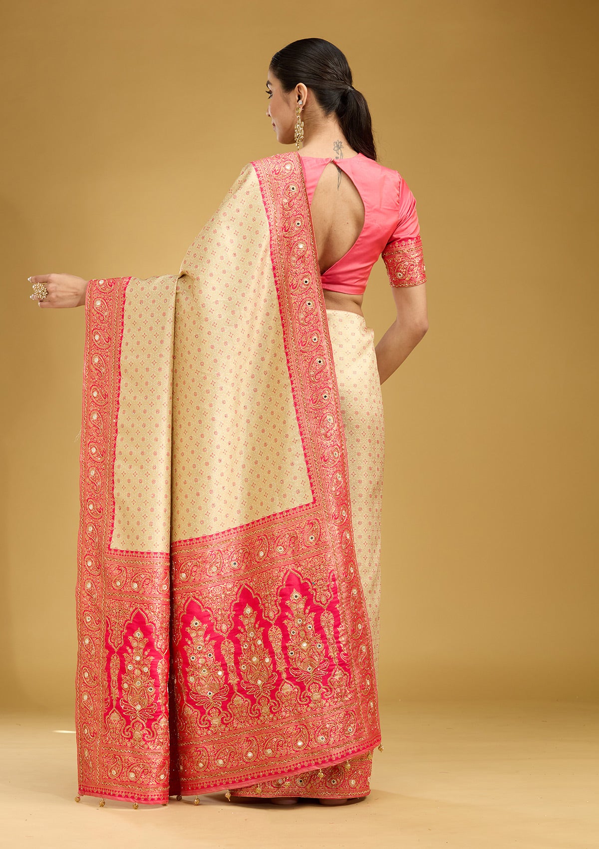 Cream Silk_Saree in Art Silk fabric. The Silk_Saree is elevated with Aariwork embroidery. It comes with an Unstitched blouse. Comes with the Koskii promise of premium quality.