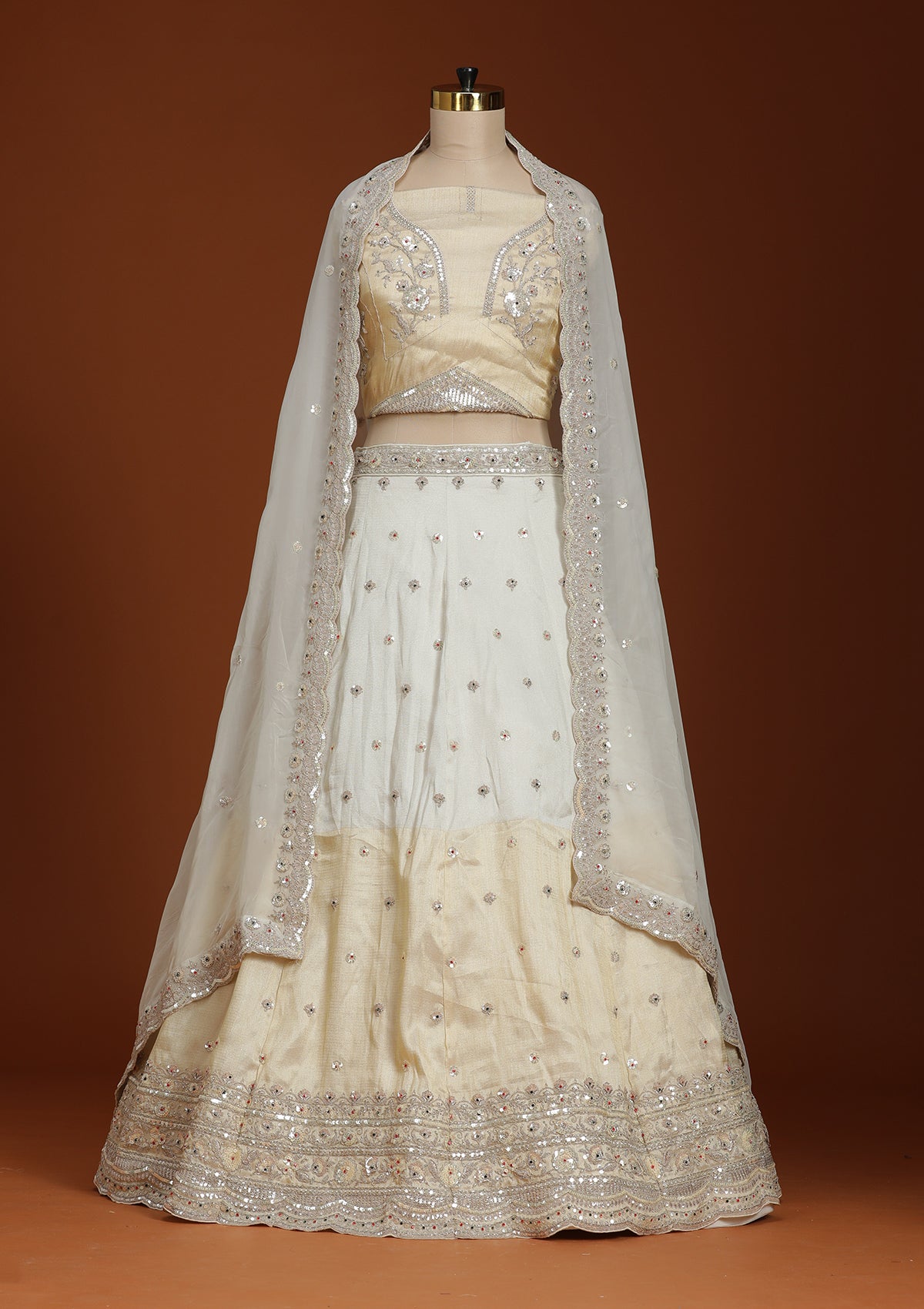 Cream Cording Tissue Semi-Stitched Lehenga