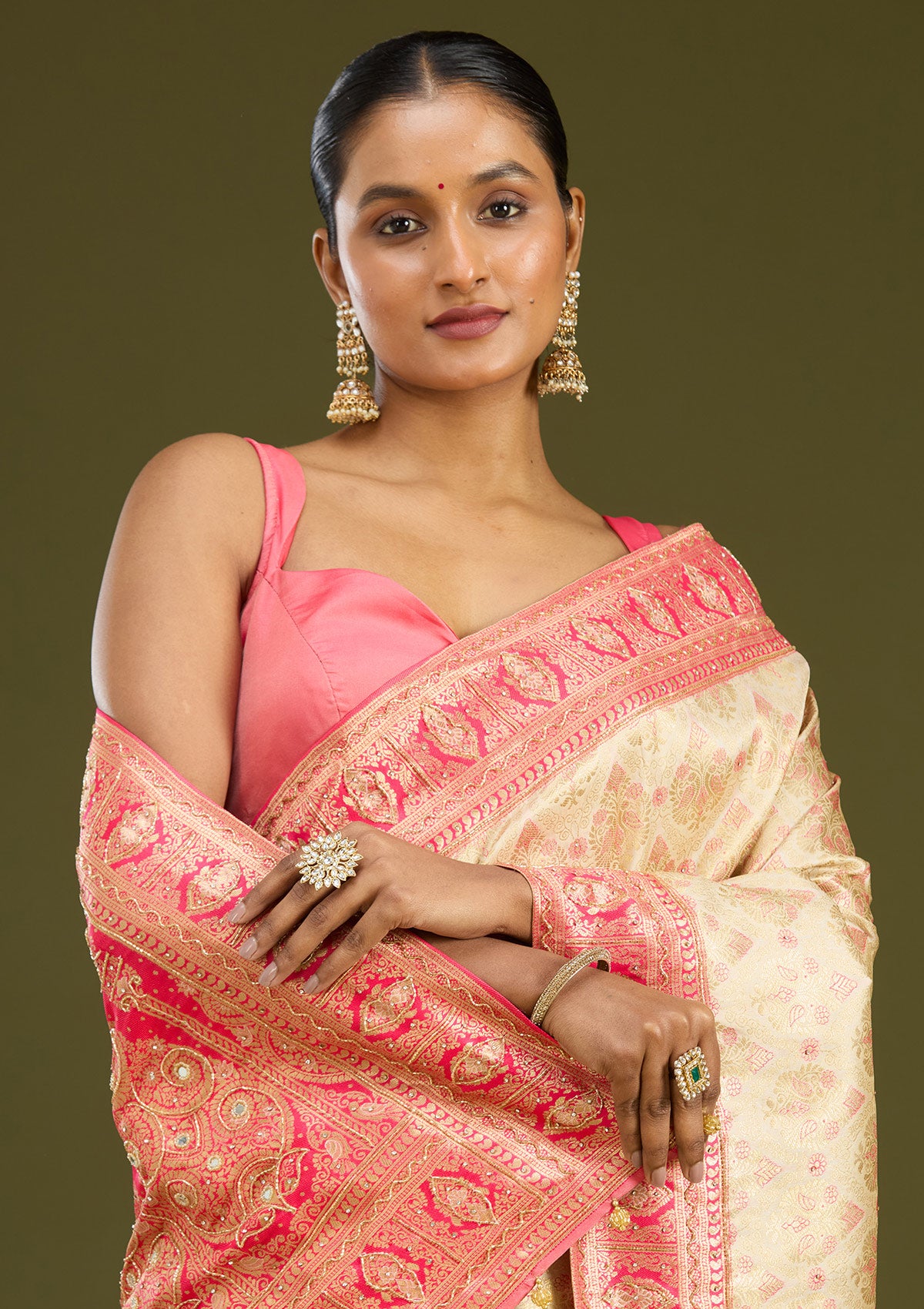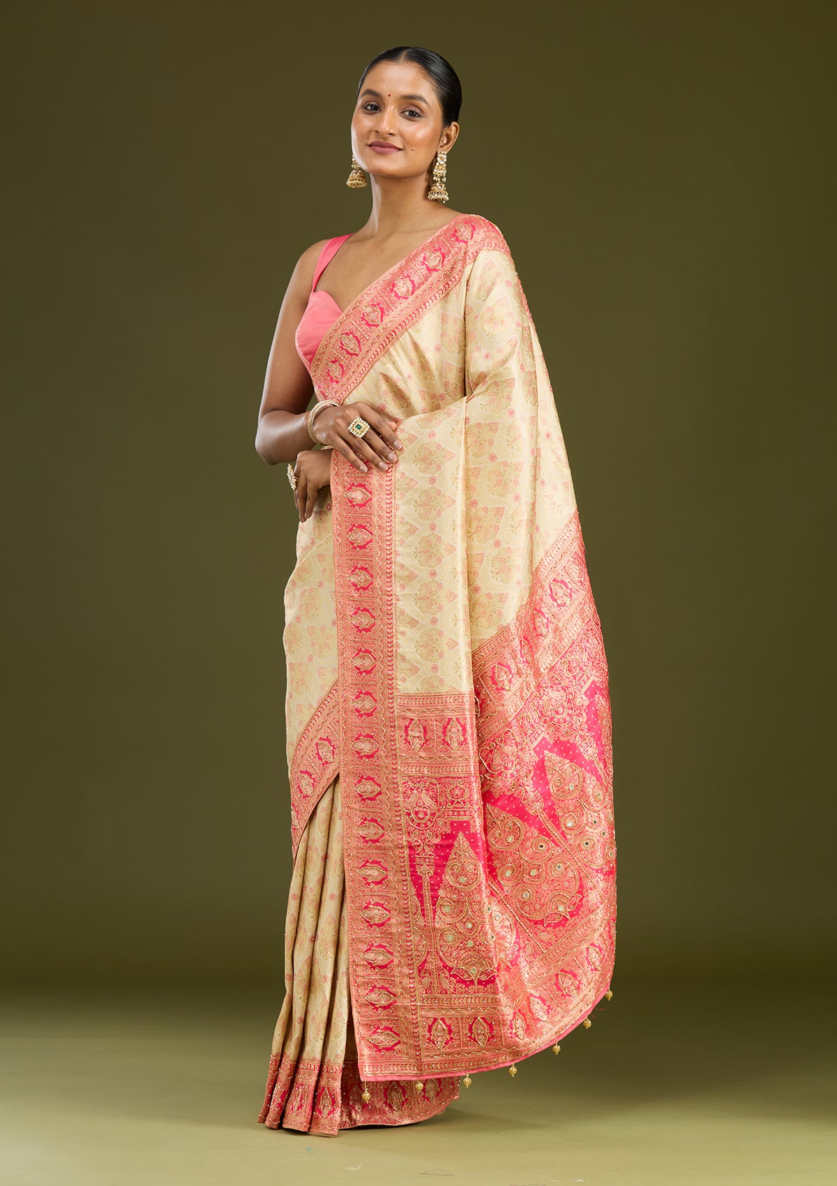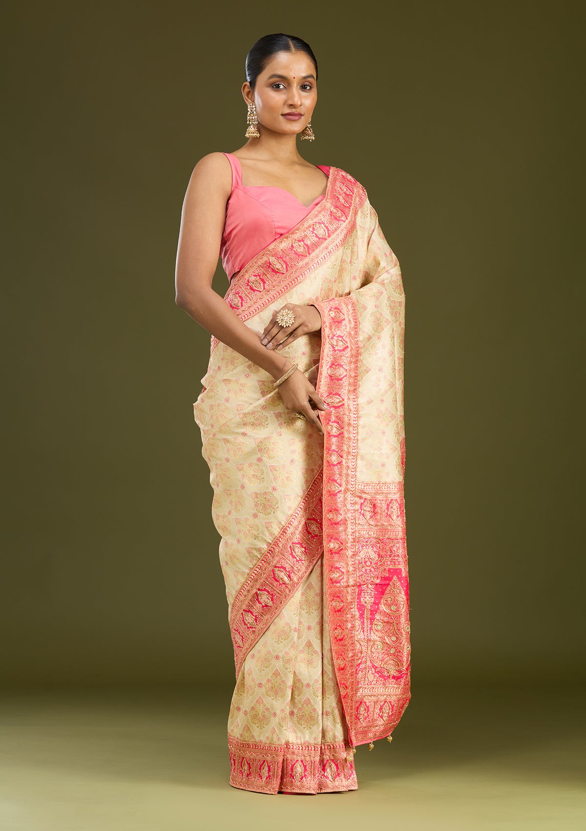 Cream Silk_Saree in Silk fabric. The Silk_Saree is elevated with Cutdana embroidery. It comes with an Unstitched blouse. Comes with the Koskii promise of premium quality.