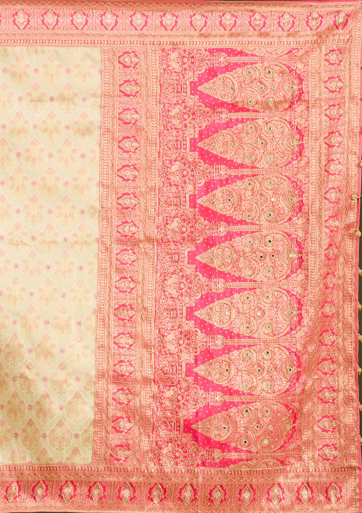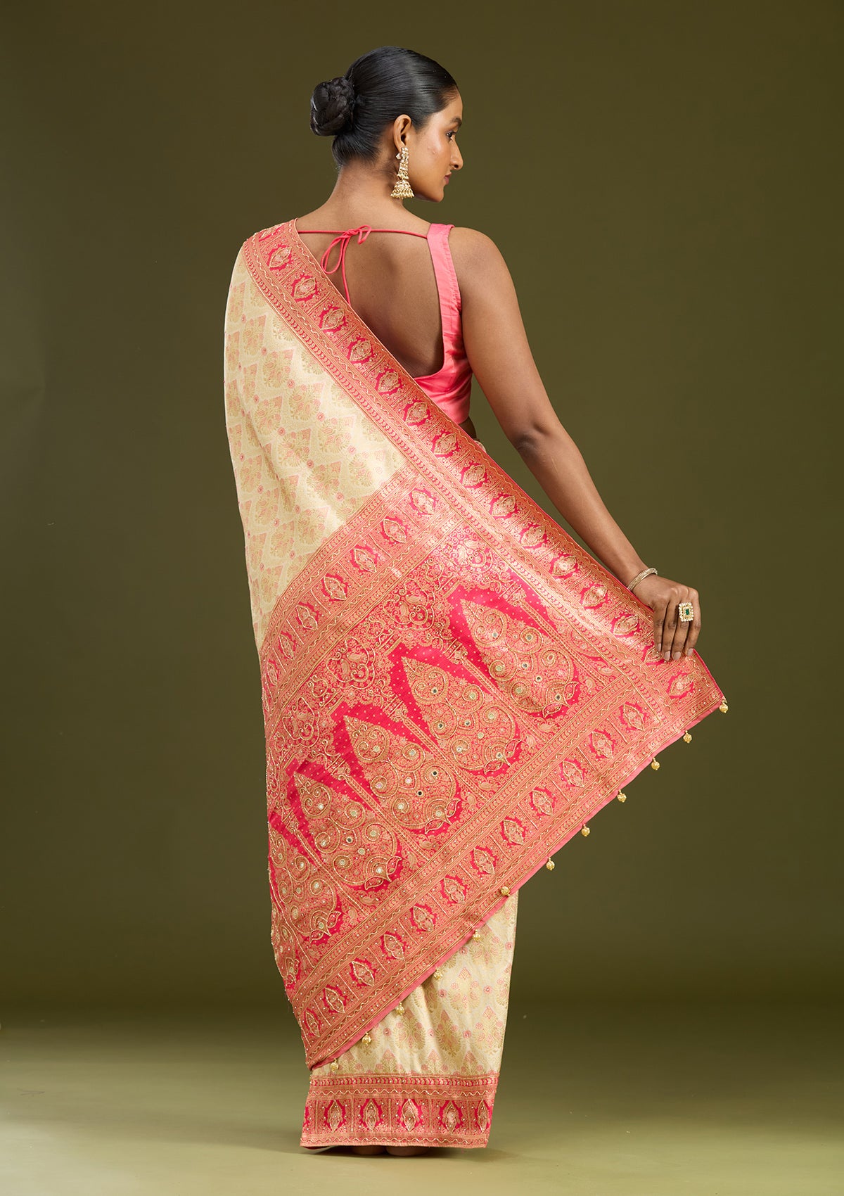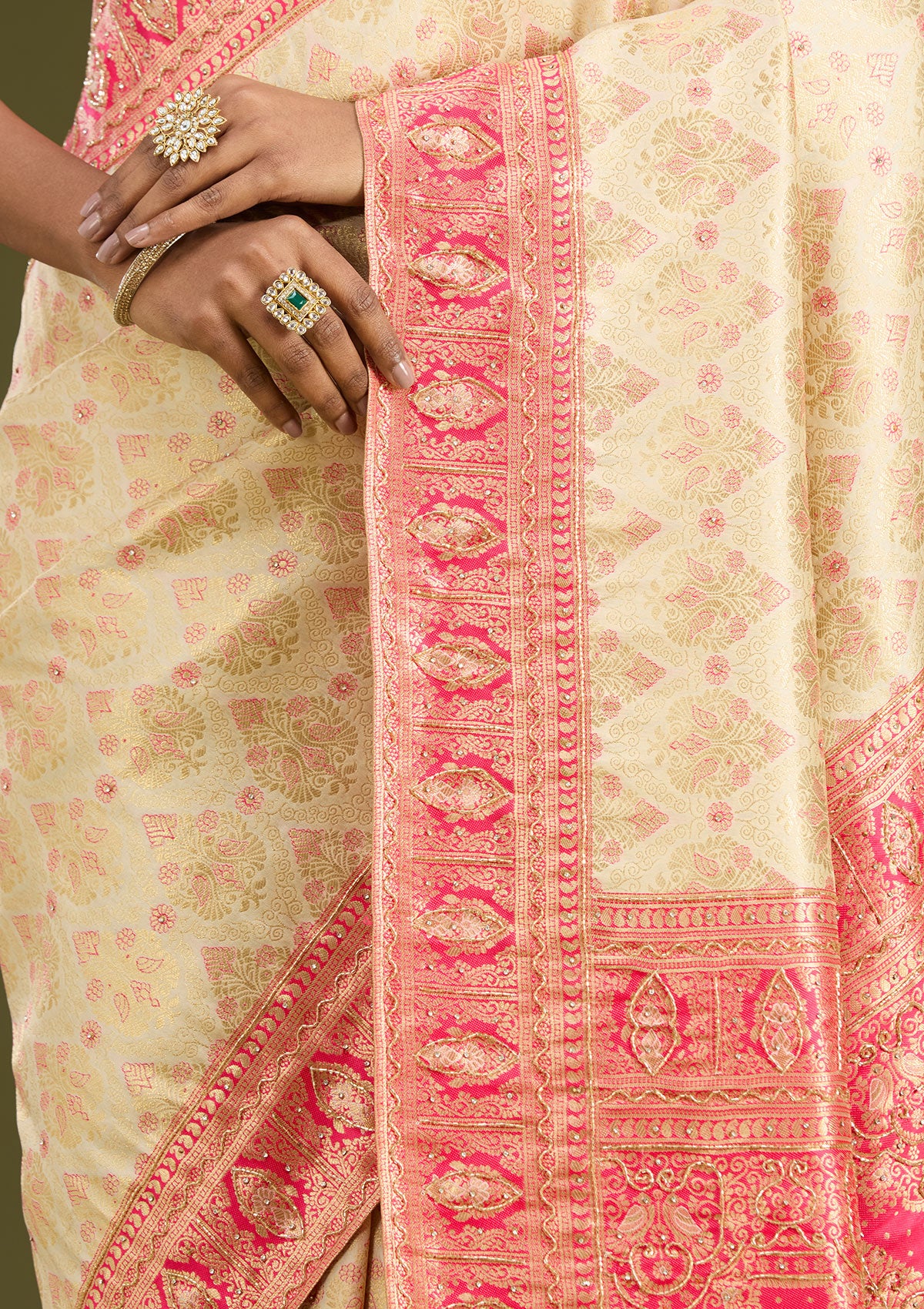 Cream Silk_Saree in Silk fabric. The Silk_Saree is elevated with Cutdana embroidery. It comes with an Unstitched blouse. Comes with the Koskii promise of premium quality.